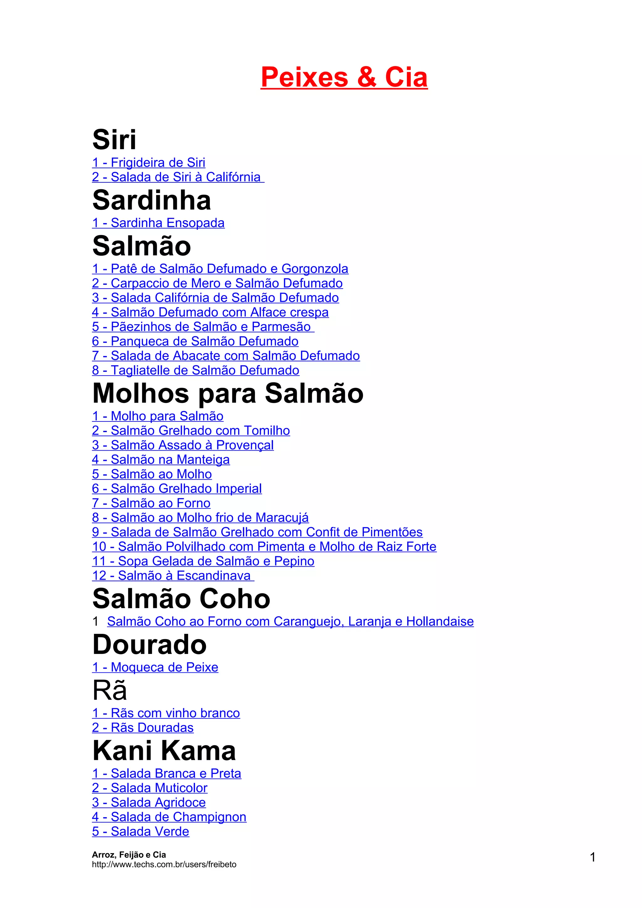 O documento lista receitas de peixes e frutos do mar, incluindo siri, sardinha, salmão, lagosta, camarão e outros. As receitas de salmão incluem patê de salmão defumado com gorgonzola, carpaccio de mero e salmão defumado, e salada califórnia de salmão defumado. Há também receitas para outros tipos de peixe como robalo, linguado e bacalhau.