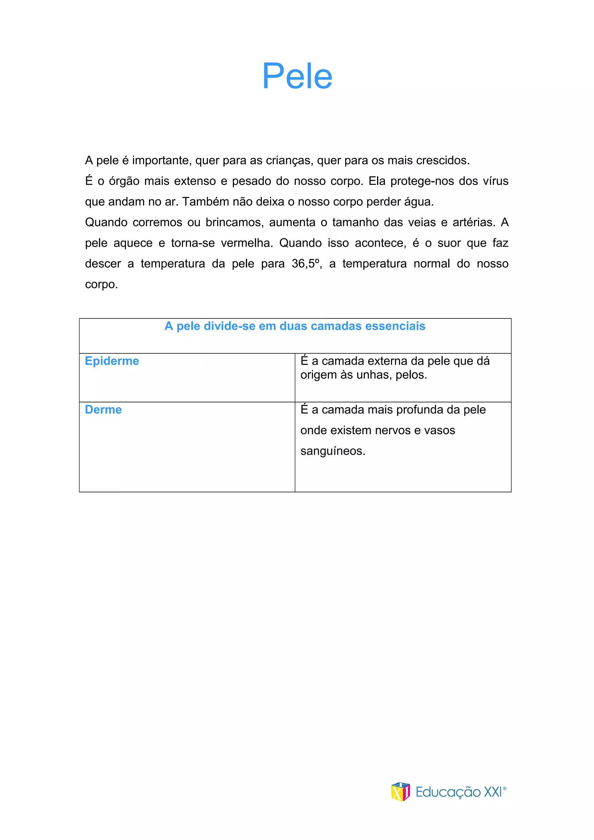 A pele é o órgão mais extenso do corpo humano, protegendo contra vírus e perda de água, e ajuda a regular a temperatura corporal através do suor quando exercício aumenta o fluxo sanguíneo para a pele. A pele consiste nas camadas externa epiderme e interna derme, que contém nervos e vasos sanguíneos.