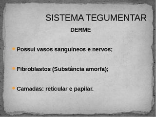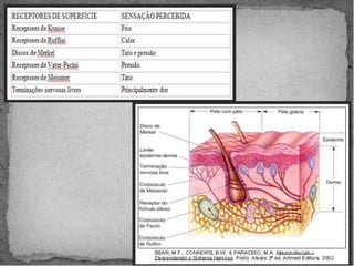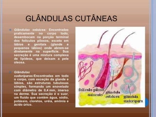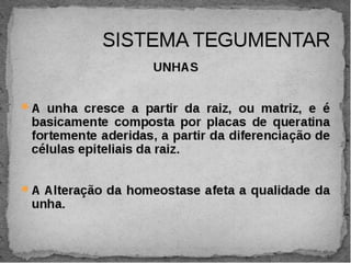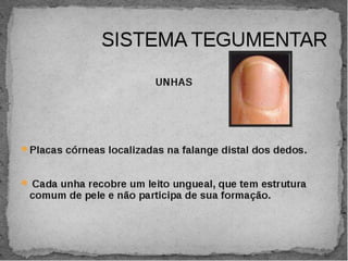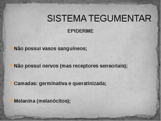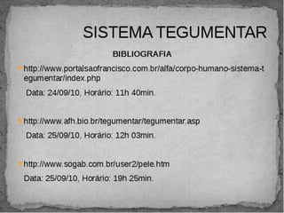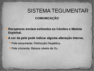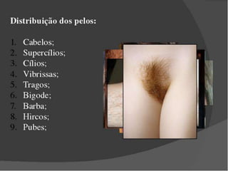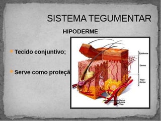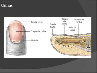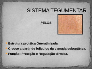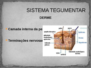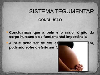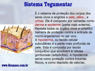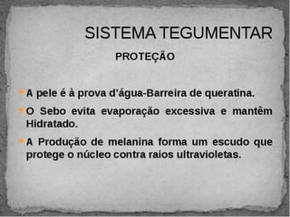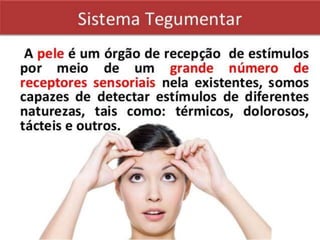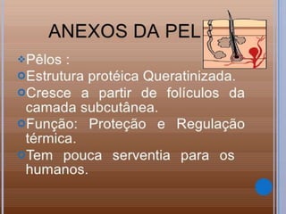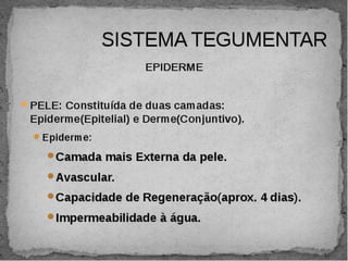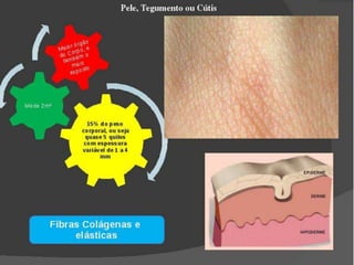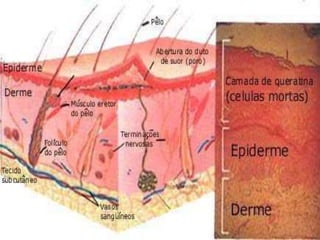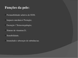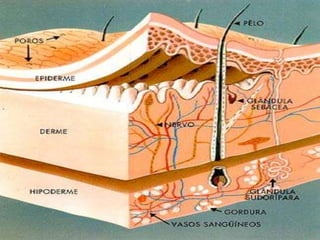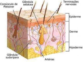 A pele é o maior órgão do corpo humano, correspondendo a 16% do peso corporal, e é formada por três camadas: epiderme, derme e hipoderme. A pele serve como barreira contra infecções, regula a temperatura do corpo, remove produtos de excreção, protege contra radiação ultravioleta e permite sensações táteis.