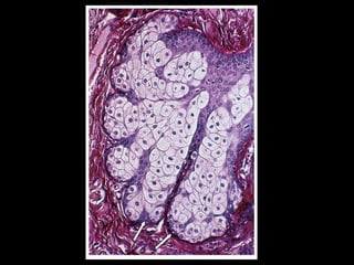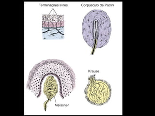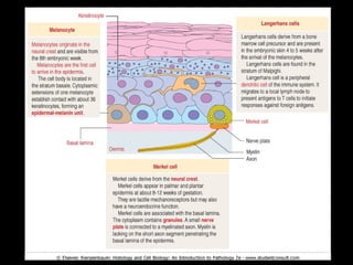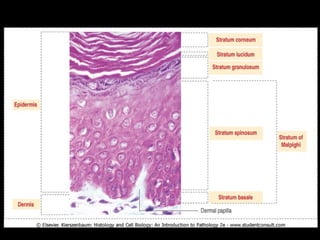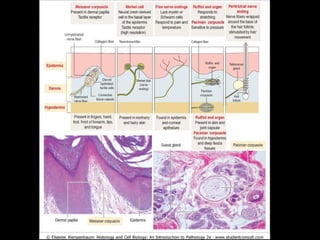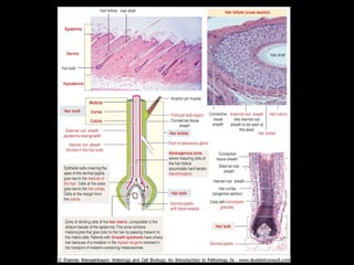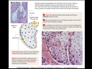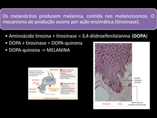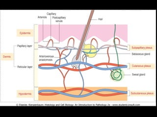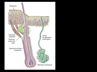O documento aborda as características e funções da pele, incluindo proteção, comunicação e termorregulação. Detalha a estrutura da epiderme, derme e hipoderme, bem como a presença de glândulas sebáceas e sudoríparas, destacando suas funções e tipos. Também menciona a vascularização e os receptores sensoriais presentes na pele.
