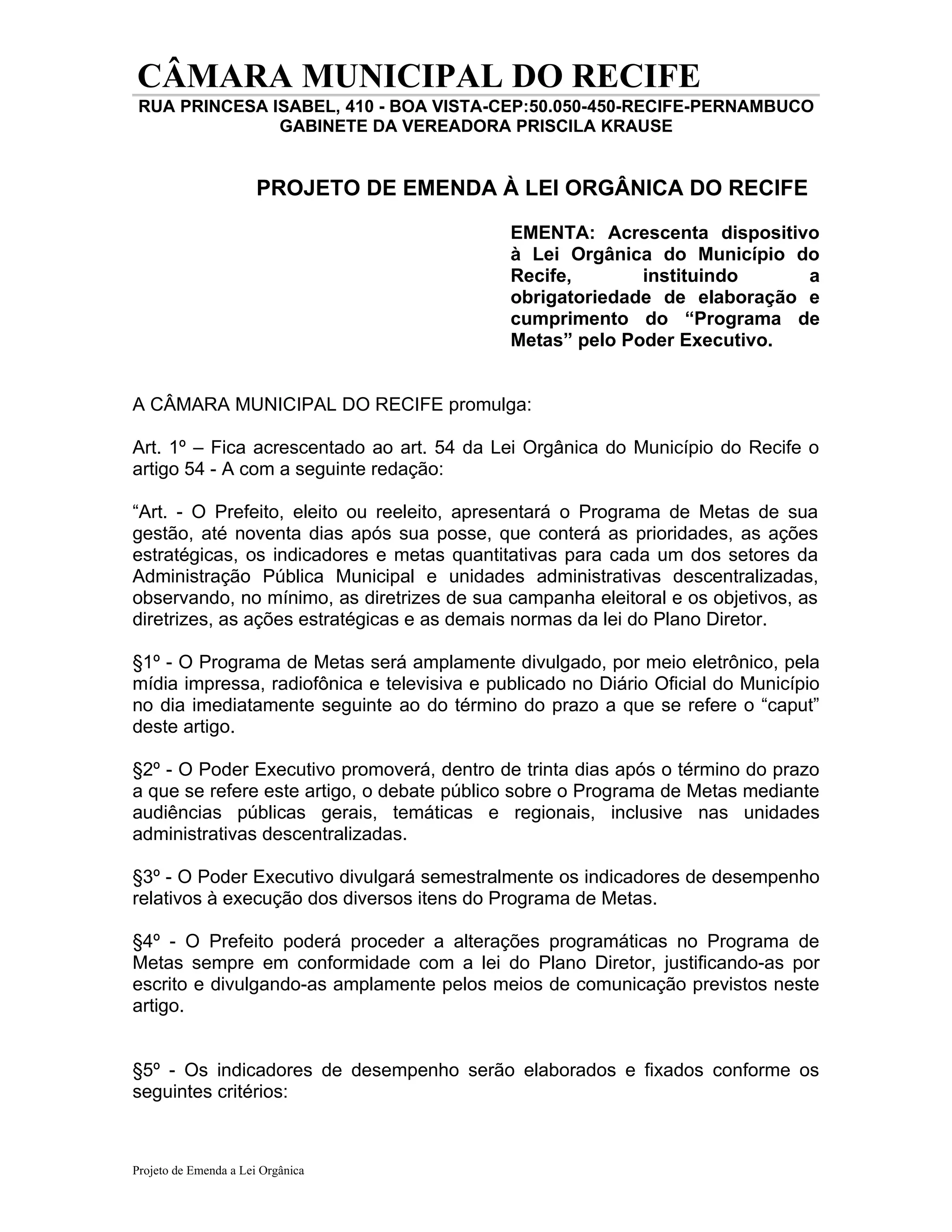 O documento propõe uma emenda à Lei Orgânica do Município do Recife para instituir a obrigatoriedade de elaboração e cumprimento do "Programa de Metas" pelo Poder Executivo, definindo prazos, procedimentos de divulgação e acompanhamento.