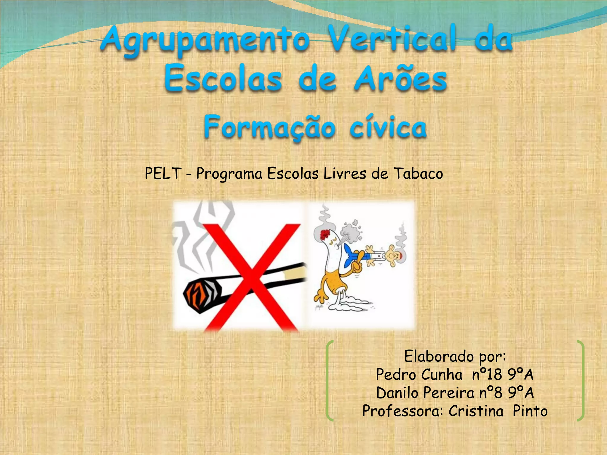 O documento discute o Programa Escolas Livres de Tabaco (PELT) e seus objetivos de prevenir o início do consumo de tabaco entre jovens. O PELT visa educar sobre os perigos do fumo, que contém cerca de 4000 produtos químicos prejudiciais à saúde. Além dos riscos para fumantes, o fumo passivo também ameaça a saúde de não fumantes. O tabaco traz consequências financeiras e de saúde significativas tanto para indivíduos quanto para a sociedade.