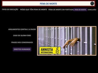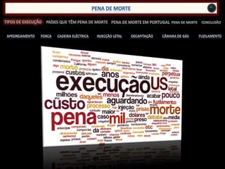 O documento descreve as várias formas históricas de aplicação da pena de morte através de métodos como apedrejamento, forca, cadeira elétrica, injeção letal, decapitação, câmara de gás, fuzilamento. Fornece detalhes sobre como cada método é aplicado e o sofrimento causado à vítima.