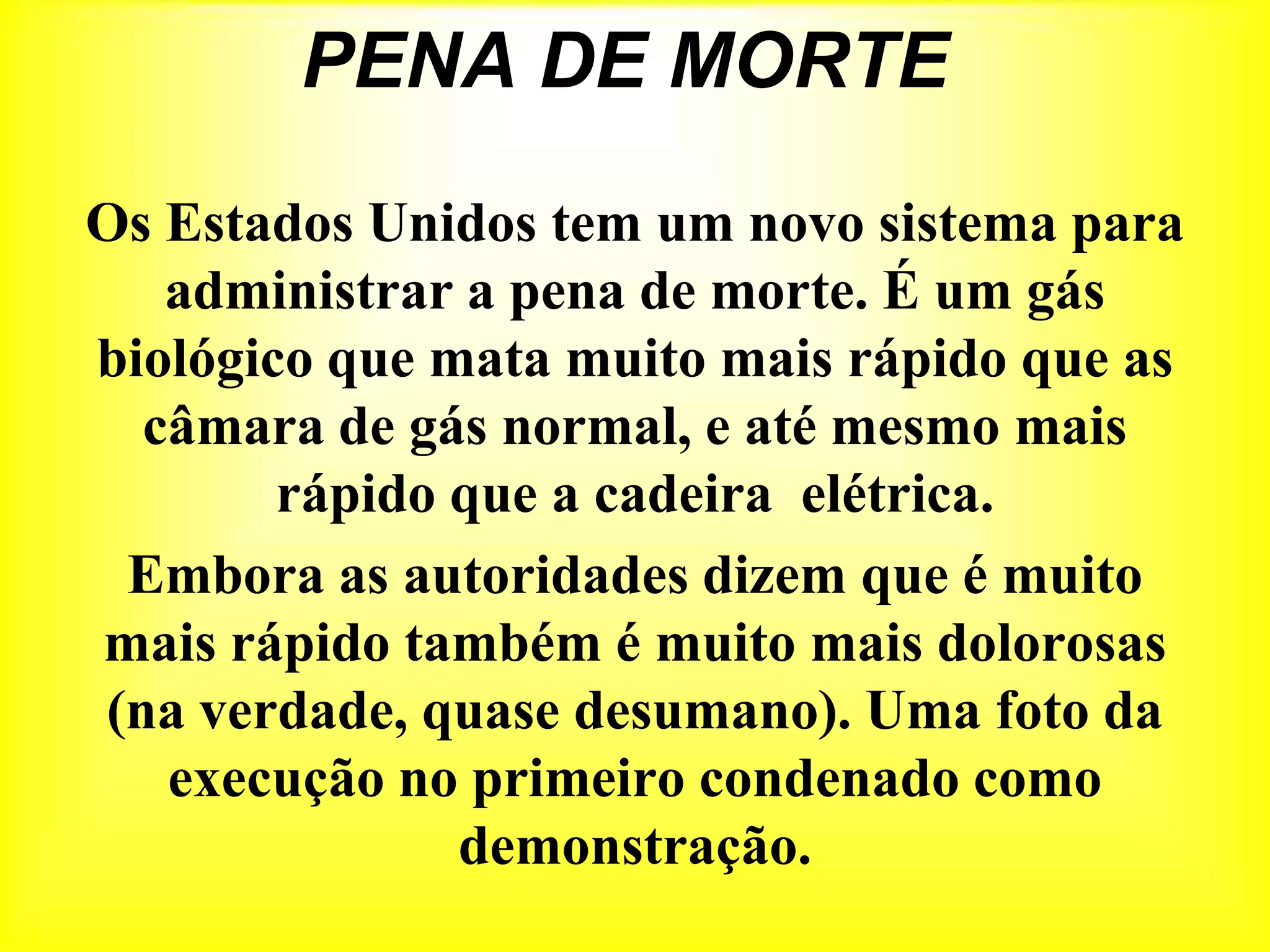 Os Estados Unidos introduziu um novo gás letal para execuções que mata mais rápido do que métodos anteriores, como a câmara de gás e a cadeira elétrica, embora possa ser mais doloroso e quase desumano, como demonstra uma foto da primeira execução com este método.