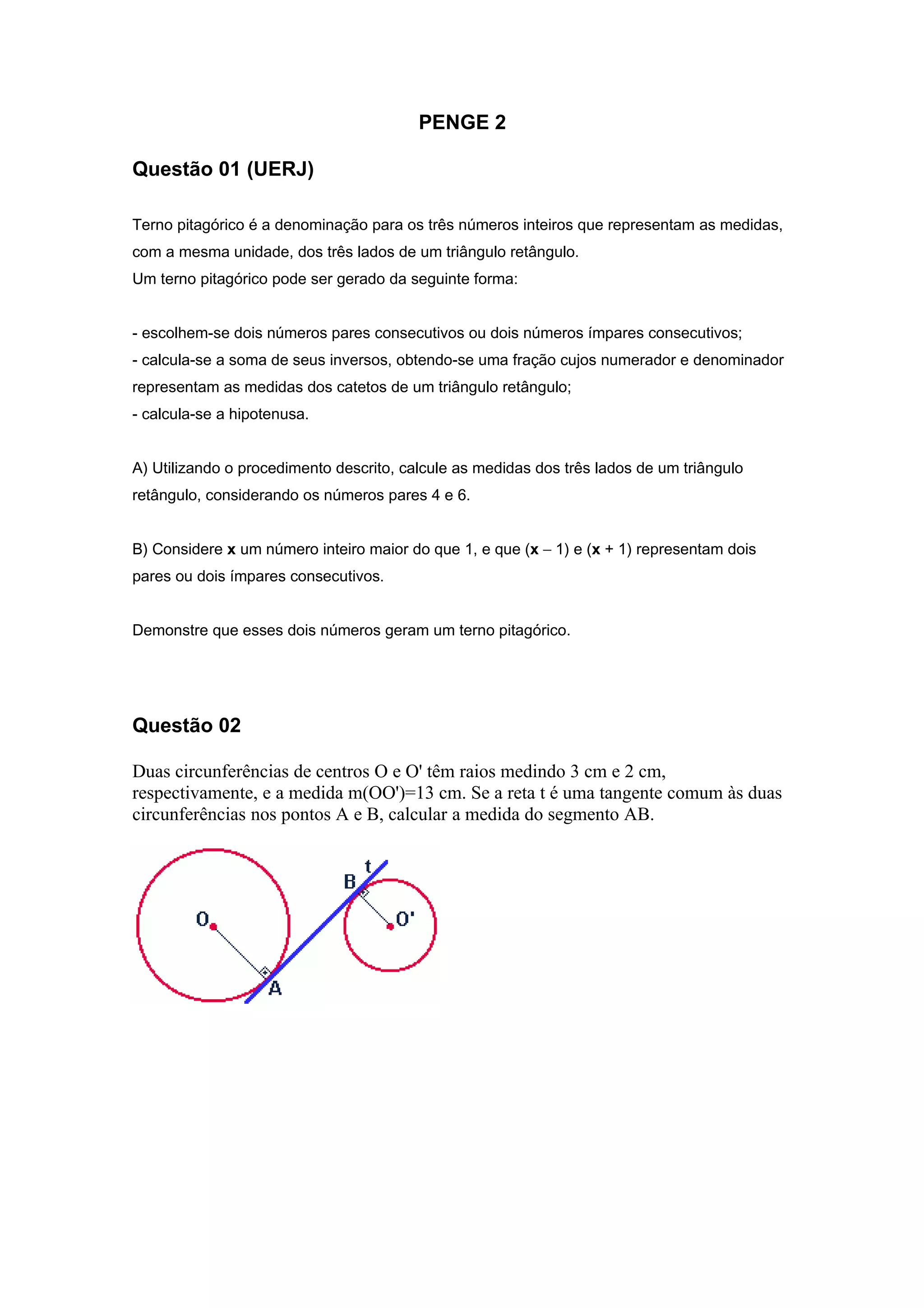 1) Um terno pitagórico é formado pelas medidas dos lados de um triângulo retângulo. 2) O documento fornece um método para gerar ternos pitagóricos usando números pares ou ímpares consecutivos. 3) A questão pede para calcular as medidas dos lados de um triângulo retângulo usando o método com os números 4 e 6.