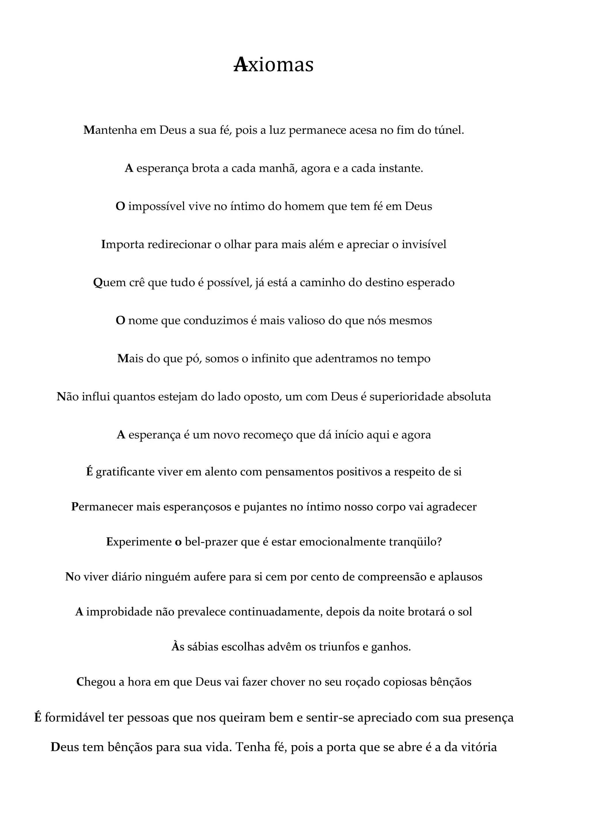 O documento enfatiza a importância da fé em Deus e da esperança. Ele diz que a luz permanece no fim do túnel e que a esperança brota a cada manhã. Também diz que com fé em Deus é possível vencer o que parece impossível e que aqueles que acreditam que tudo é possível já estão caminhando rumo ao destino desejado.