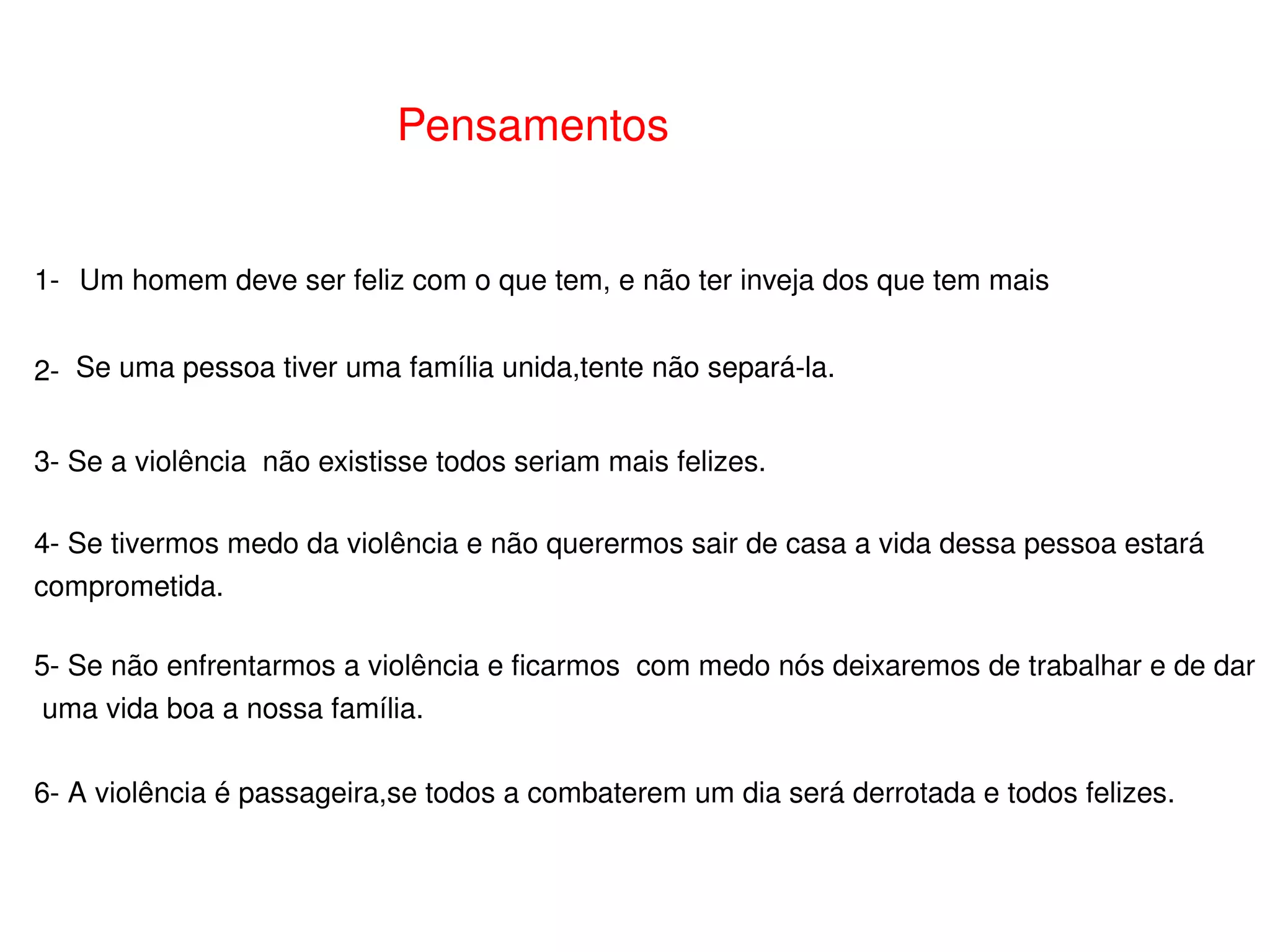 Pensamentos 1- 2-Um homem deve ser feliz com o que tem, e não ter inveja dos que tem mais Se uma pessoa tiver uma família unida,tente não separá-la. 3- Se a violência não existisse todos seriam mais felizes. 4- Se tivermos medo da violência e não querermos sair de casa a vida dessa pessoa estará comprometida. 5- Se não enfrentarmos a violência e ficarmos com medo nós deixaremos de trabalhar e de dar uma vida boa a nossa família. 6- A violência é passageira,se todos a combaterem um dia será derrotada e todos felizes.