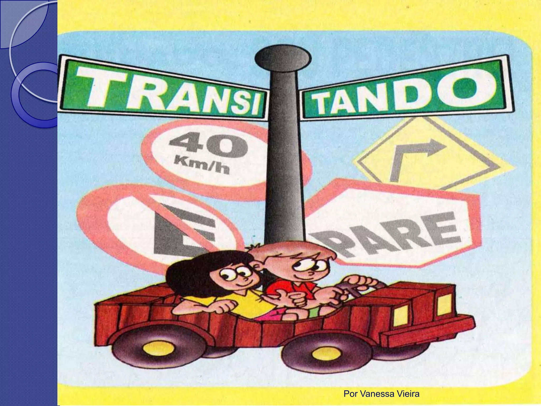 O documento aborda diferentes meios de transporte e o papel das placas de trânsito, que transmitem mensagens essenciais para garantir a ordem e segurança nas vias. As placas são categorizadas em regulamentação, advertência e indicação, cada uma com propósitos específicos, como informar obrigações, alertar sobre perigos e orientar motoristas. Além disso, menciona placas educativas e auxiliares que contribuem para a navegação e segurança viária.