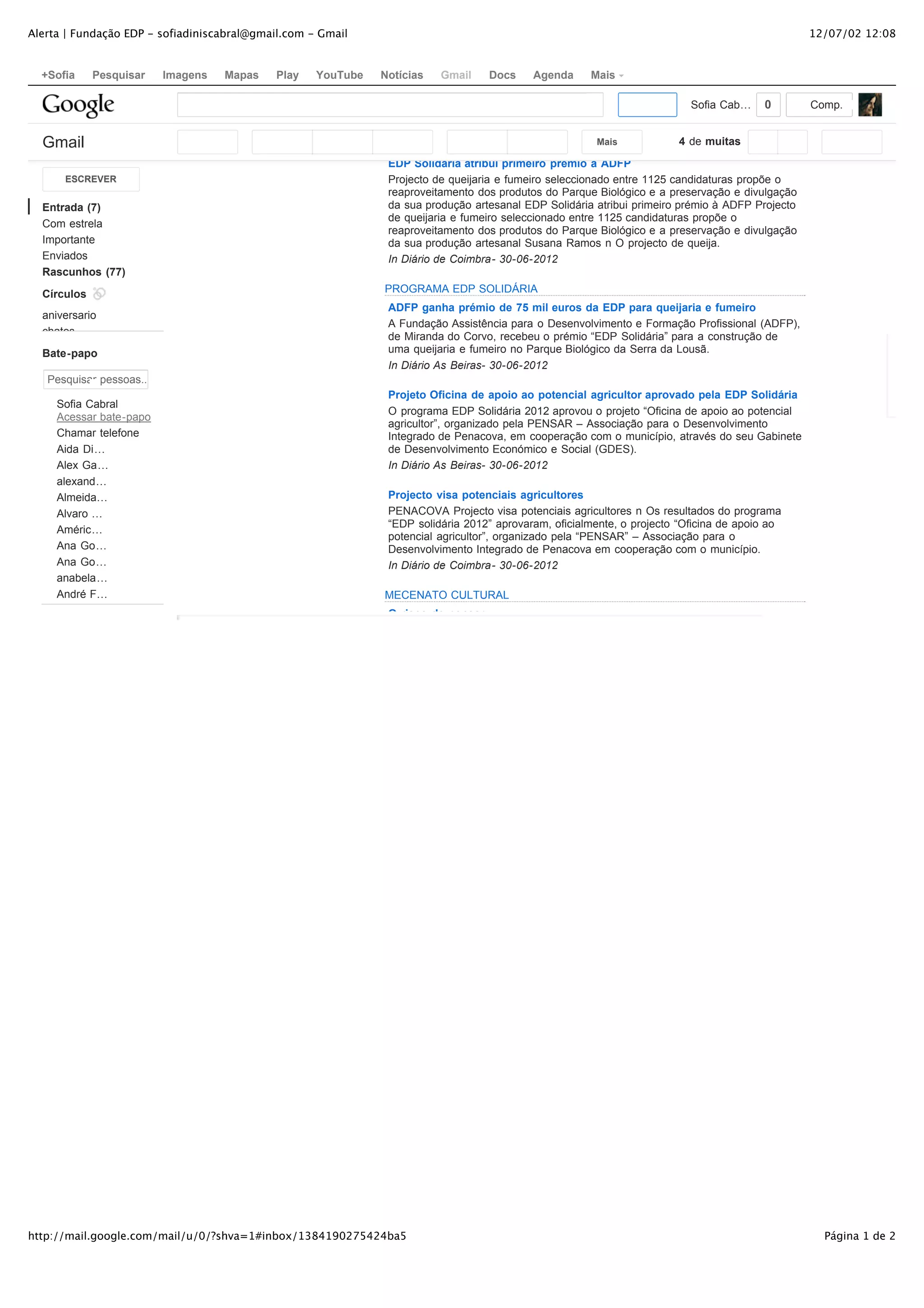 O documento descreve três projetos que receberam prêmios do programa EDP Solidária em 2012: 1) Um projeto de queijaria e fumeiro da ADFP foi selecionado entre 1125 candidaturas. 2) A PENSAR recebeu um prêmio para um projeto de apoio a agricultores. 3) Um projeto cultural sobre os riscos de pensar também foi premiado.