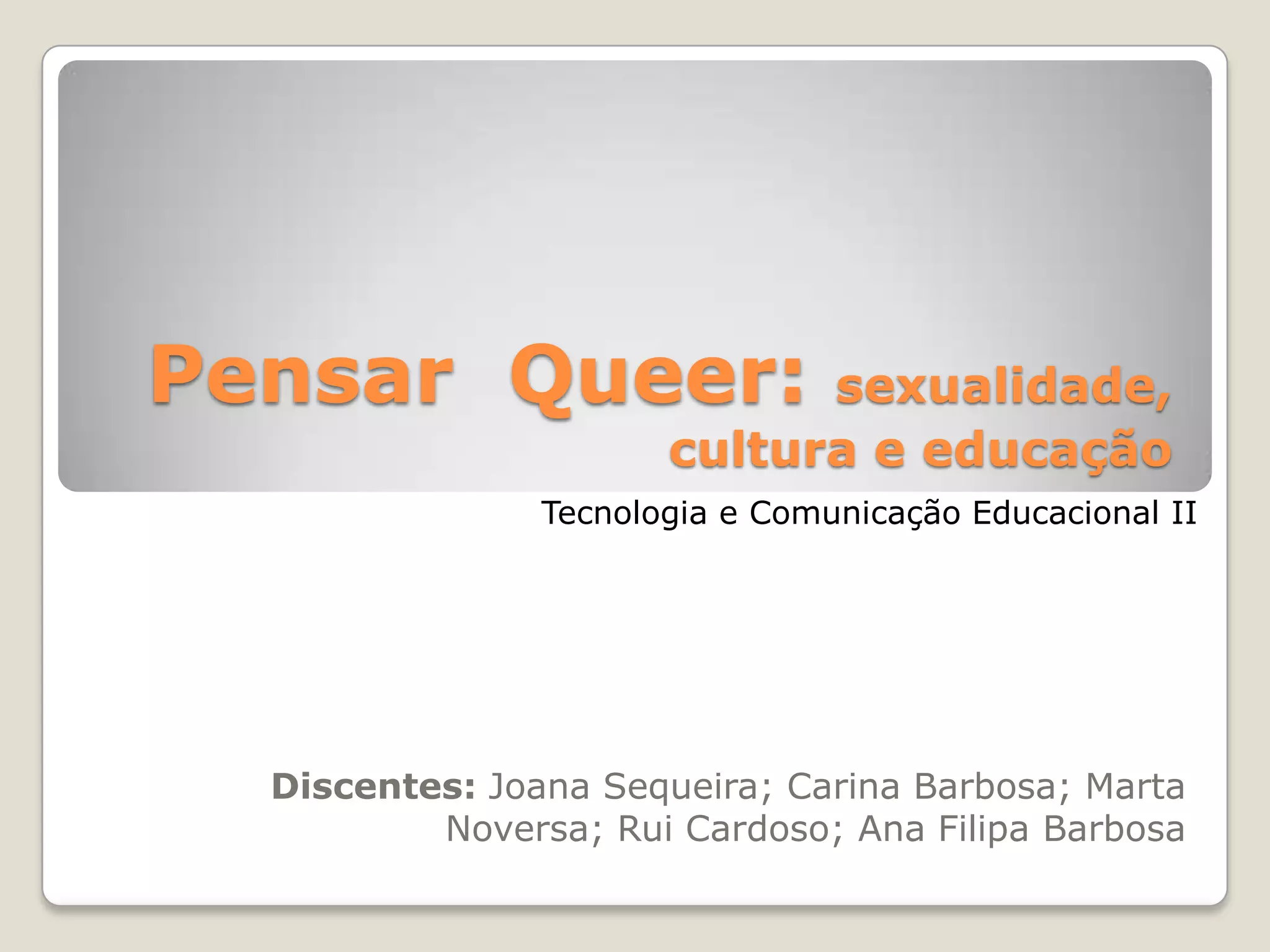 O documento discute a teoria queer, abordando tópicos como identidade, sexualidade, representação e discriminação. Apresenta também análises de obras culturais que retratam a temática da homossexualidade.