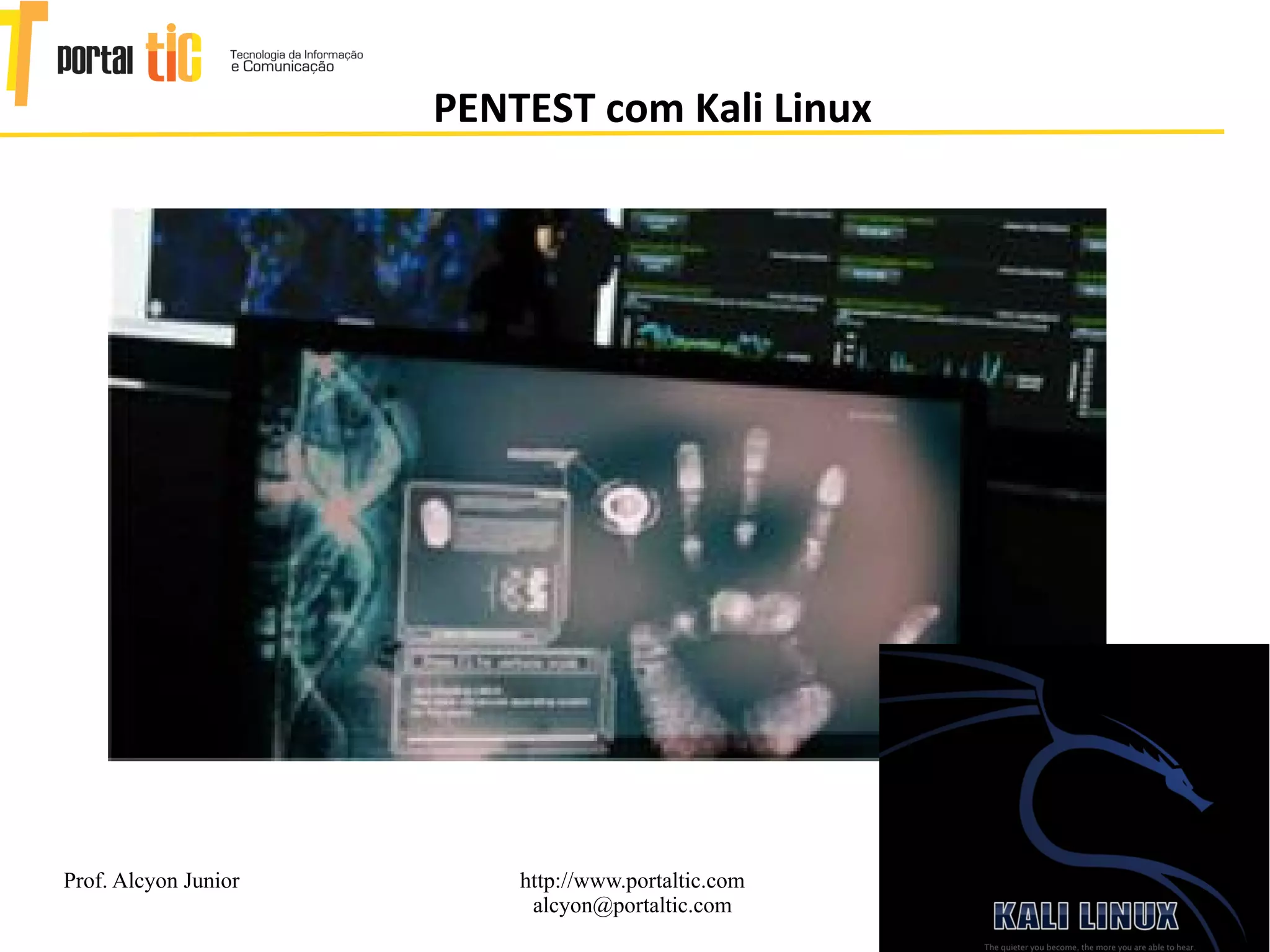 O documento apresenta um tutorial sobre teste de penetração (pentest) utilizando o Kali Linux. Aborda conceitos como reconhecimento, terminologia de segurança, engenharia social e ferramentas para coleta de informações sobre alvos.