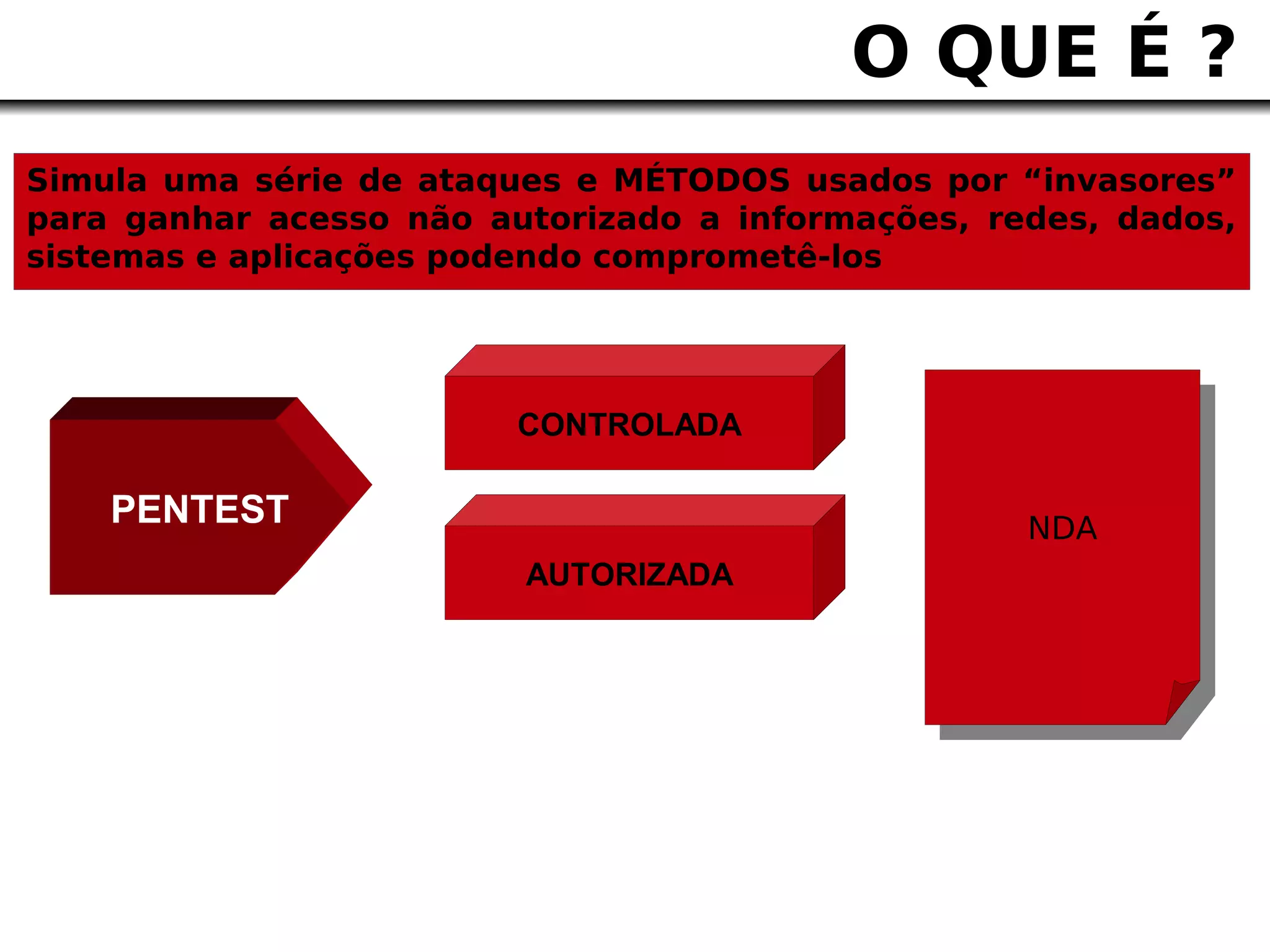 O documento discute testes de penetração (pentest) e fornece as seguintes informações essenciais: