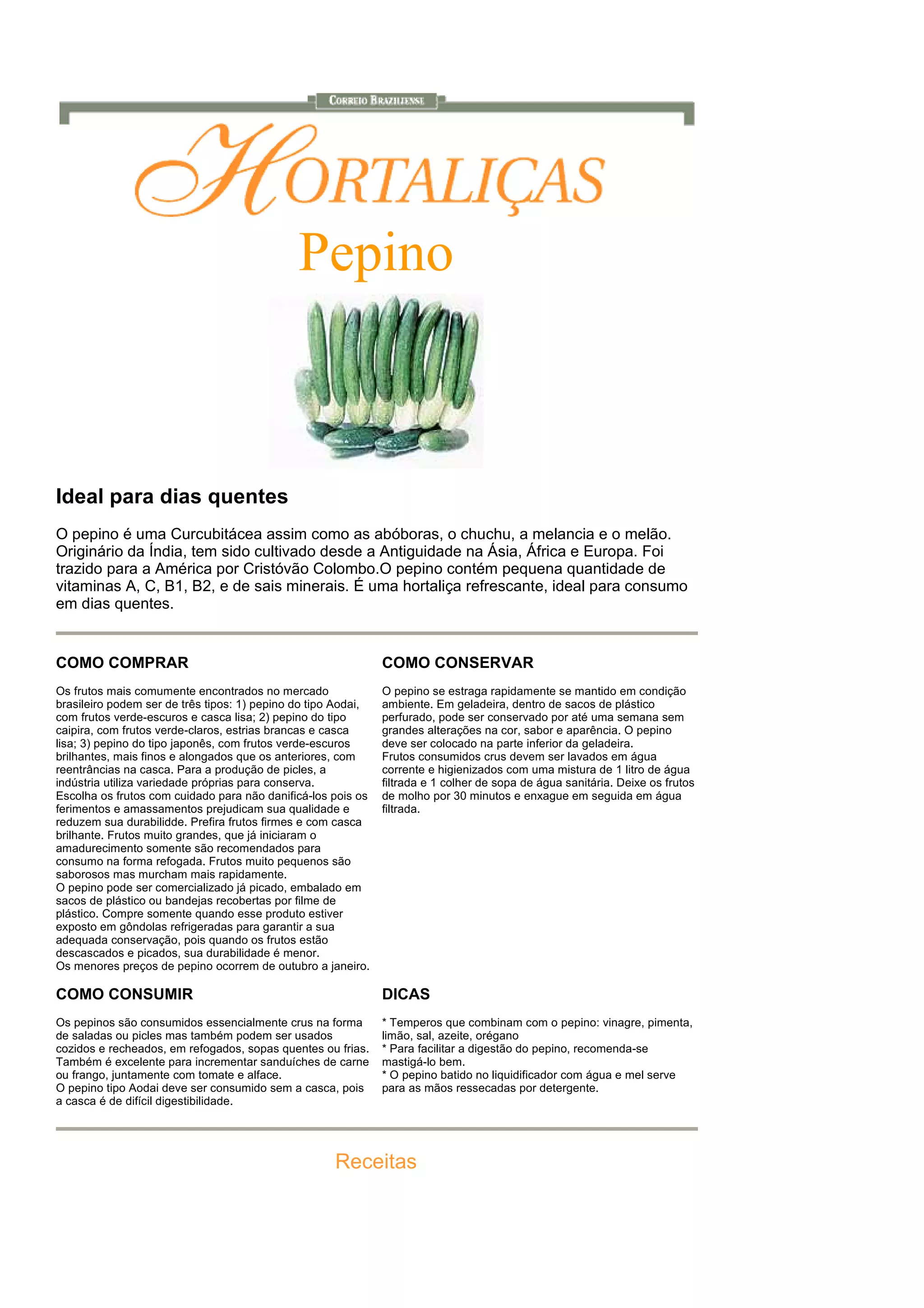 cozidos e recheados, em refogados, sopas quentes ou frias. * Para facilitar a digestão do pepino, recomenda-se