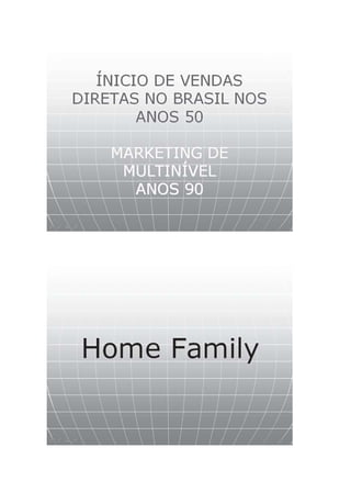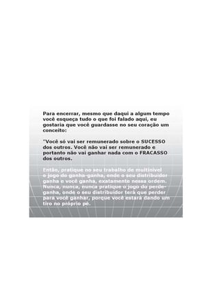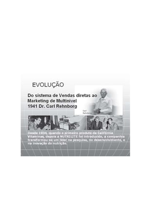 Capítulo 1 - O Dr. Carl Rehnborg lançou nos EUA em 1941 o primeiro sistema de marketing multinível, pagando comissões em vários níveis da rede de vendas. Inspirado por suas observações sobre nutrição e hábitos culturais na China, Rehnborg desenvolveu suplementos alimentares e um modelo de negócios que remunerava todos os participantes da cadeia de distribuição.