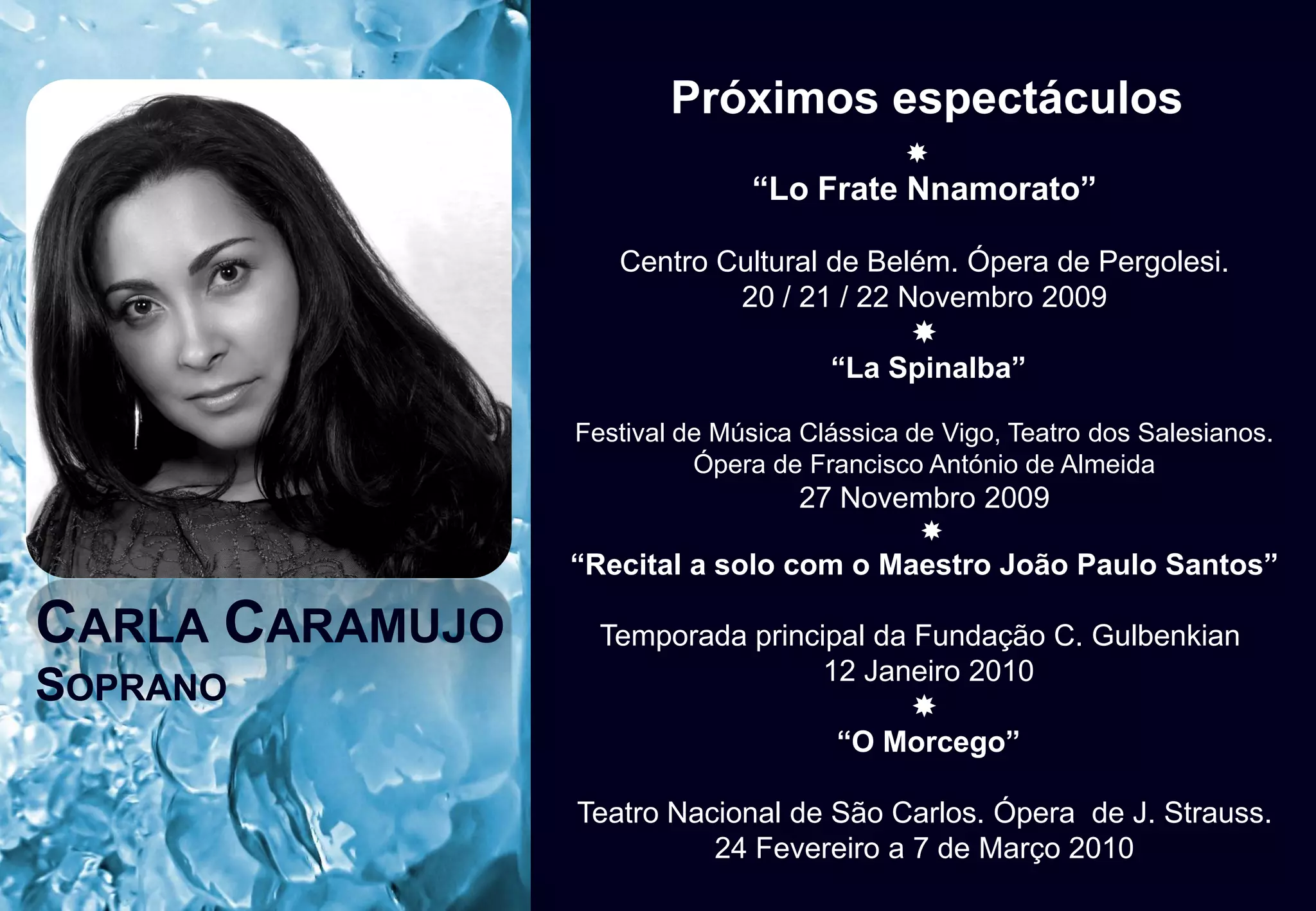 Próximos espectáculos da soprano Carla Caramujo incluem "Lo Frate Nnamorato" no Centro Cultural de Belém em Novembro, "La Spinalba" no Festival de Música Clássica de Vigo em Novembro, e um recital com o Maestro João Paulo Santos na Fundação Gulbenkian em Janeiro de 2010. Ela também se apresentará em "O Morcego" no Teatro Nacional de São Carlos de Fevereiro a Março de 2010.