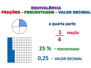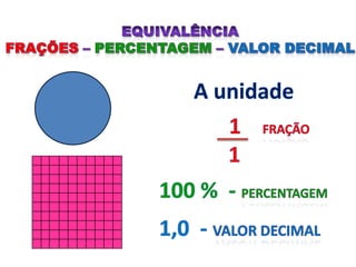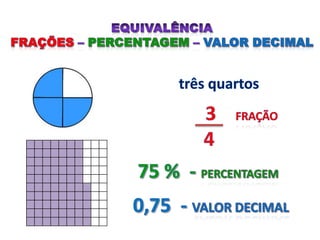 O documento explica os conceitos básicos de percentagem, incluindo que percentagem é uma fração de 100 partes e o significado do símbolo %. Fornece exemplos de como calcular aumentos, descontos e porcentagens em situações como vendas, populações e outros dados.