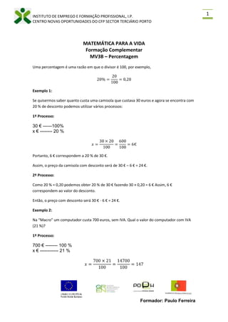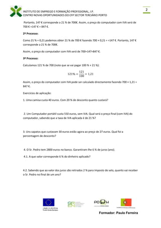 Este documento explica como calcular percentagens usando vários métodos, incluindo descontos, IVA e juros. Fornece exemplos de como calcular o preço com desconto de uma camisa e o preço final de um computador com IVA adicionado, além de exercícios sobre esses tópicos.