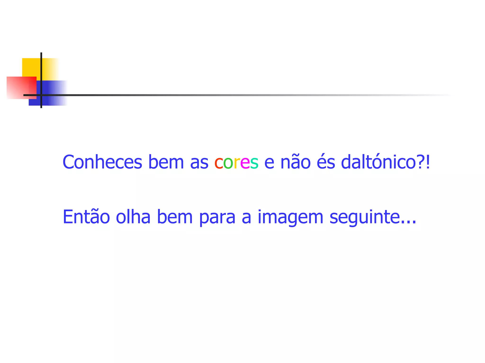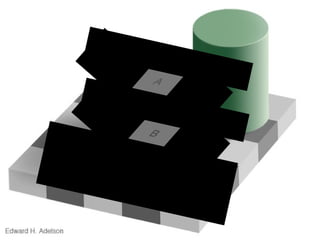O documento descreve um experimento visual onde dois quadrados de mesma cor são percebidos como tendo cores diferentes devido ao contexto visual ao redor. Isto demonstra como o cérebro processa informações visuais para criar maior contraste e precisão, independentemente das cores reais presentes.