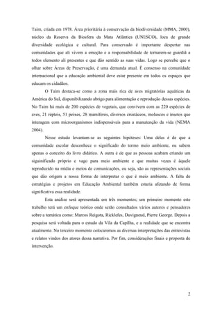 Este documento apresenta um estudo sobre a percepção ambiental da comunidade escolar sobre a Reserva Ecológica do Taim no Rio Grande do Sul. O estudo analisa as representações sociais dos moradores locais sobre o meio ambiente através de entrevistas e questionários aplicados. A pesquisa busca entender como a comunidade enxerga a relação entre o homem e a natureza na região da Reserva.