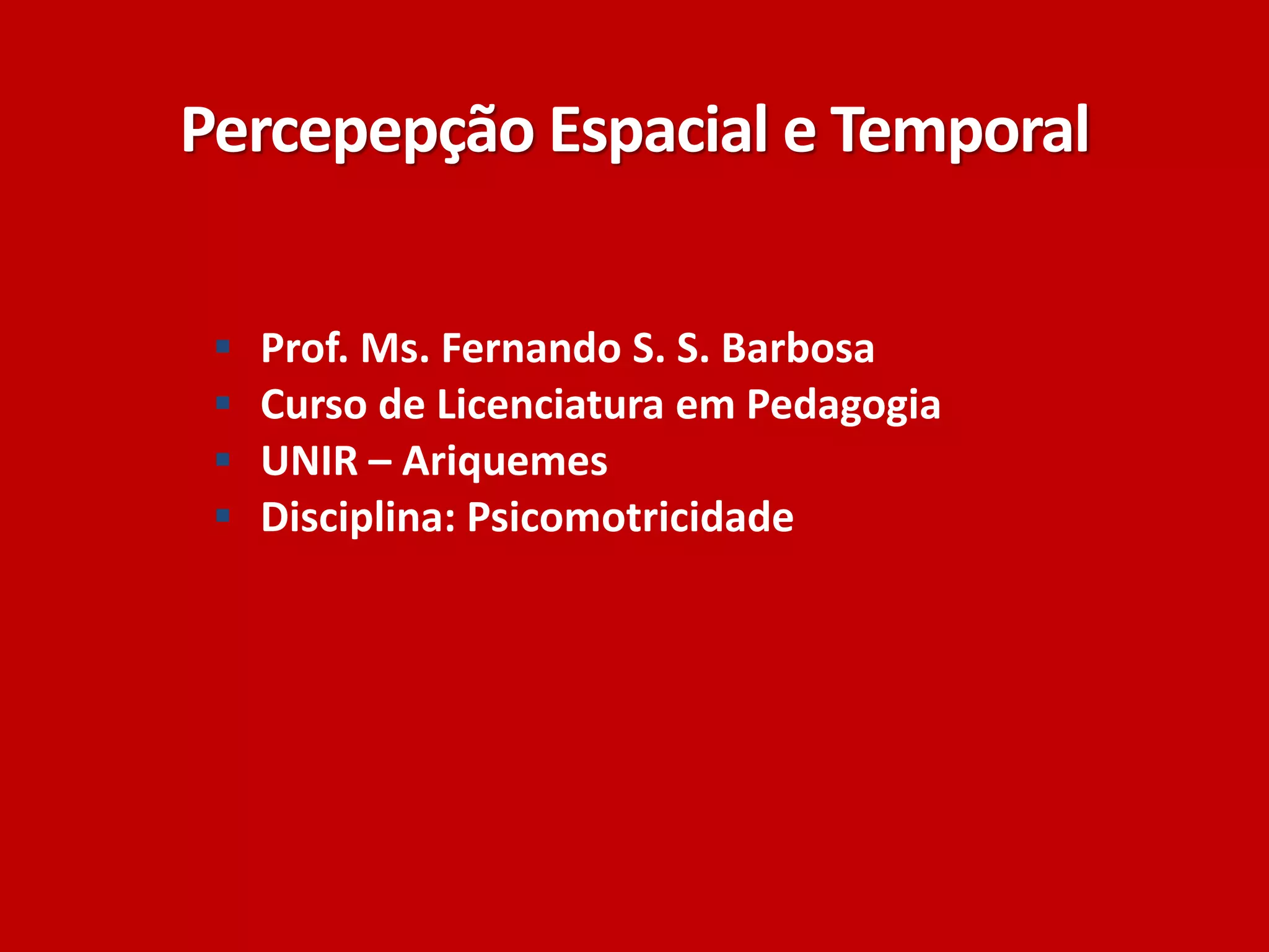 O documento discute a percepção espacial e temporal. A percepção espacial é a capacidade de perceber a localização de pessoas e objetos no espaço. A percepção temporal é mais complexa e abstrata, envolvendo a compreensão da sucessão de eventos no tempo. O documento sugere atividades para desenvolver essas percepções.