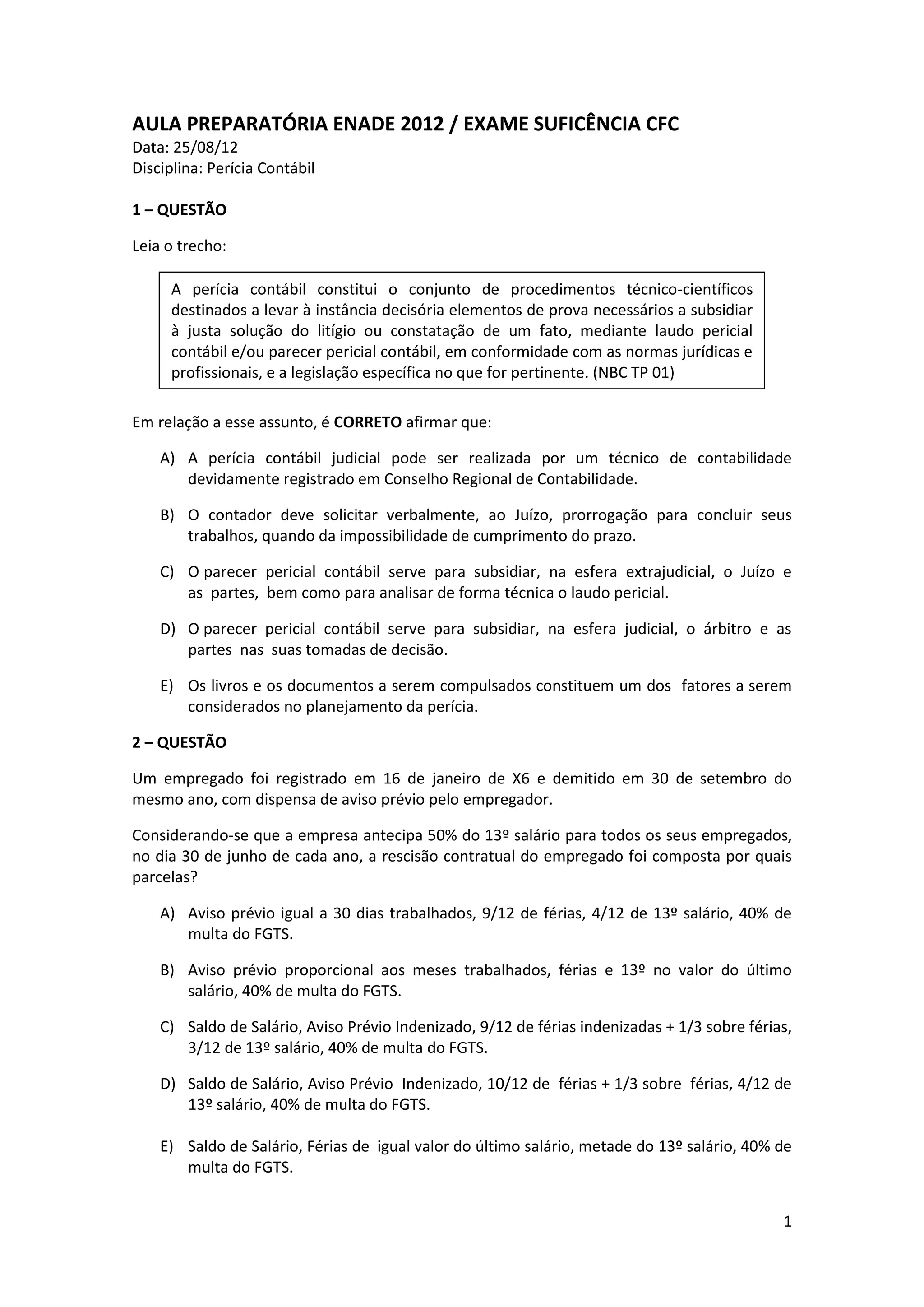 O documento apresenta uma questão sobre perícia contábil judicial. Foi realizada uma perícia para apurar os haveres de um sócio excluído de uma empresa, utilizando os dados de um balanço patrimonial especial e de uma perícia de engenharia que avaliou os bens imóveis. O perito-contador elaborou um novo balanço patrimonial ajustado com essas informações para calcular os haveres do sócio.