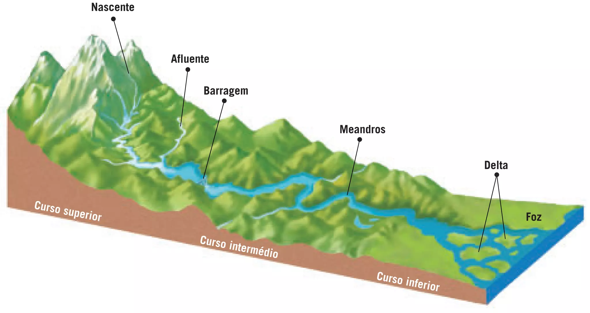 O documento descreve as principais partes de um sistema fluvial, começando com a nascente, passando pelo curso superior, curso intermediário e curso inferior até chegar no delta na foz.