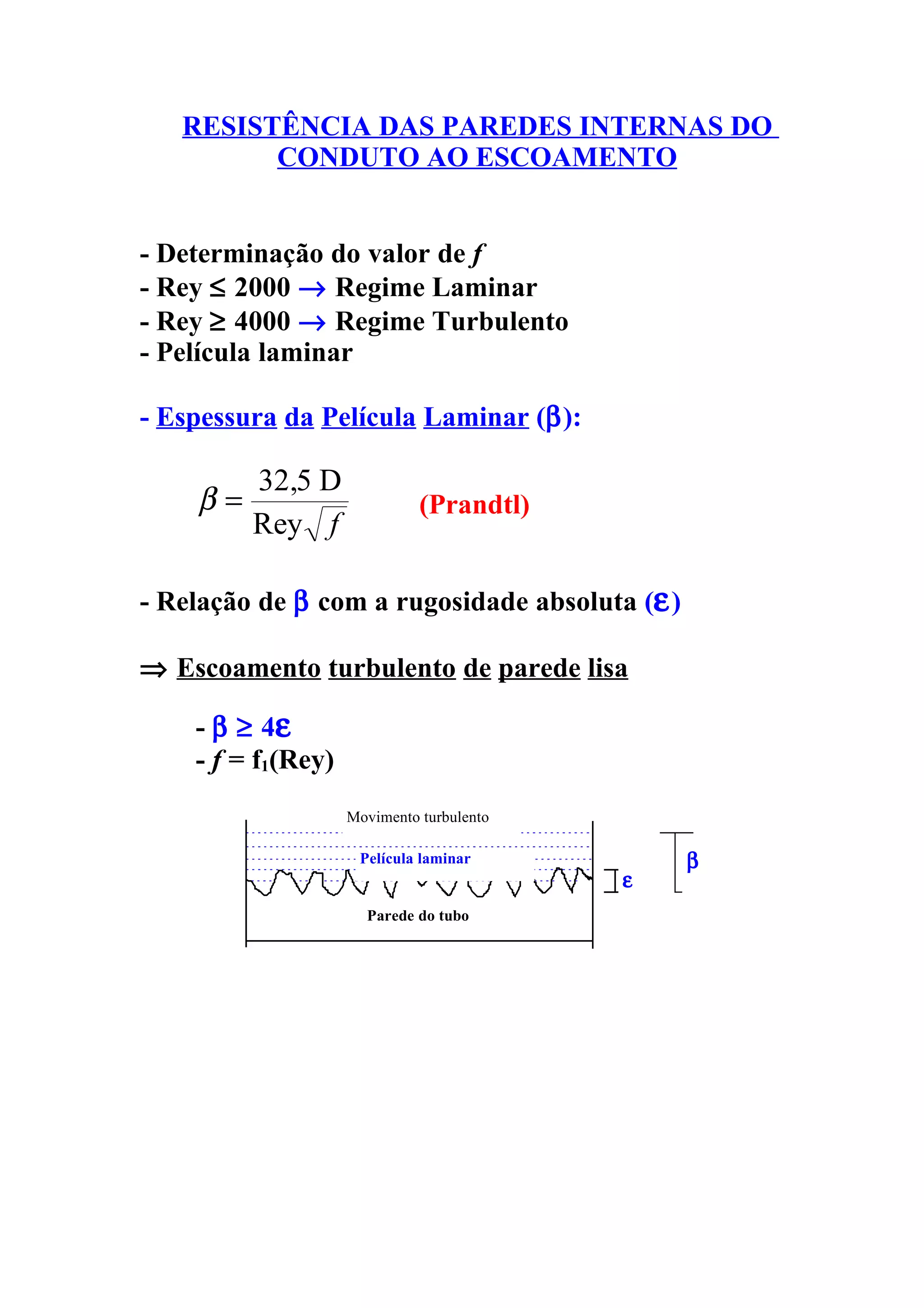O documento discute o escoamento em condutos e a determinação do coeficiente de atrito. Apresenta os diferentes regimes de escoamento e como o coeficiente de atrito depende da rugosidade da parede do conduto e do número de Reynolds. Fornece fórmulas e diagramas para calcular a perda de carga em função destes fatores.