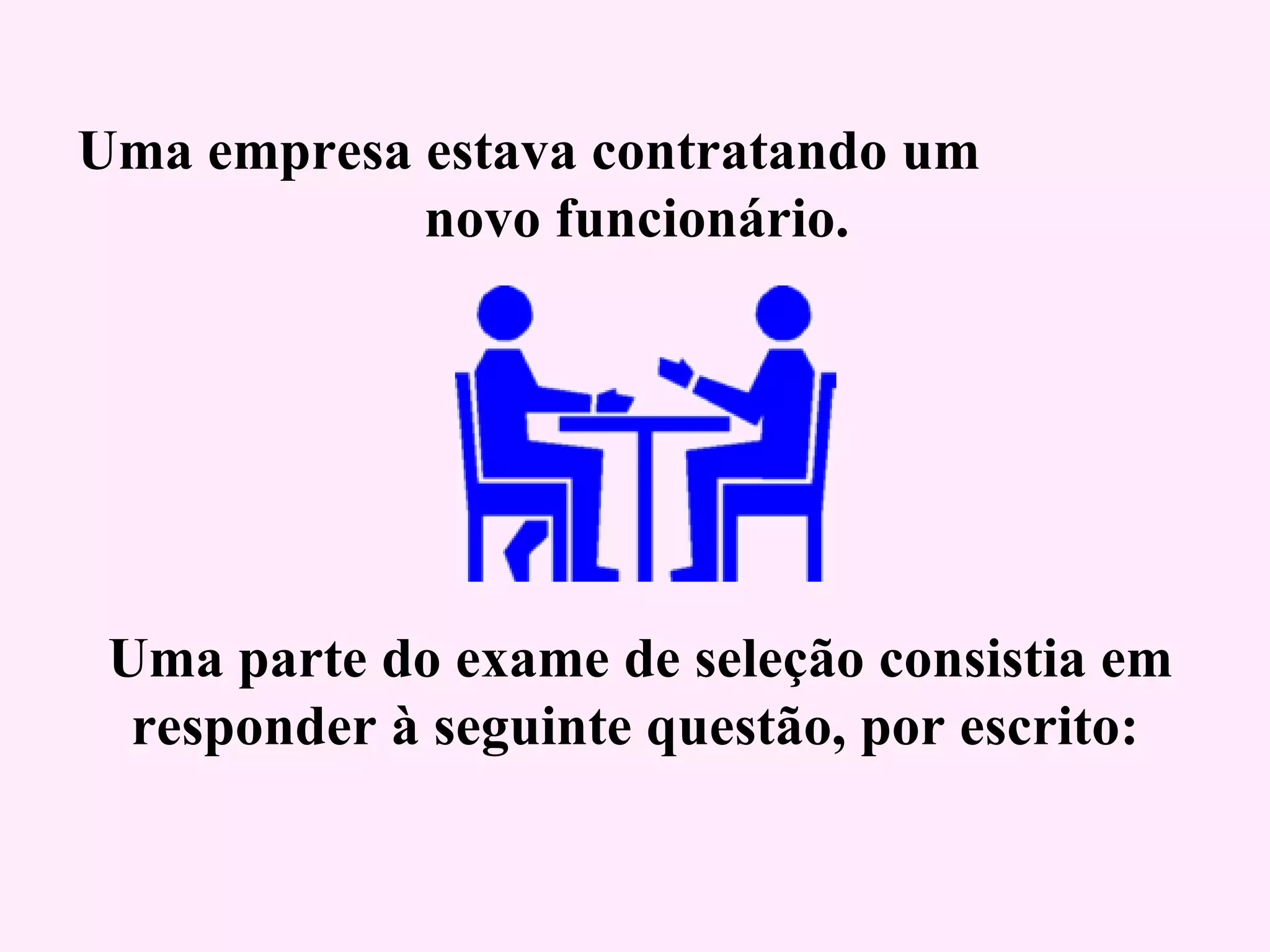1) Um candidato a uma vaga de emprego teve que responder por escrito a um teste de personalidade sobre qual pessoa salvaria em uma situação difícil; 2) O teste envolvia escolher entre salvar uma senhora doente, um médico que já havia salvado a vida do candidato ou o grande amor da vida dele; 3) O candidato que foi contratado simplesmente respondeu que daria as chaves do carro para o médico levar a senhora ao hospital e ficaria esperando o ônibus com a mulher.