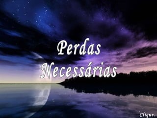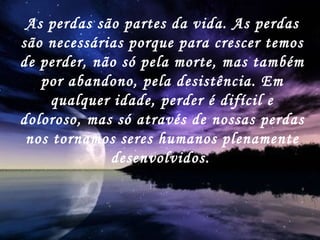O documento discute como as perdas são parte inevitável da vida e necessárias para o crescimento. Ele lista várias perdas comuns que todos enfrentamos, como a perda do amor incondicional dos pais, a perda de sonhos e ilusões, e a aceitação da mortalidade e fragilidade humana. Reconhecer e aceitar nossas perdas pode ajudar a moldar melhor nossa vida e trazer mais felicidade.