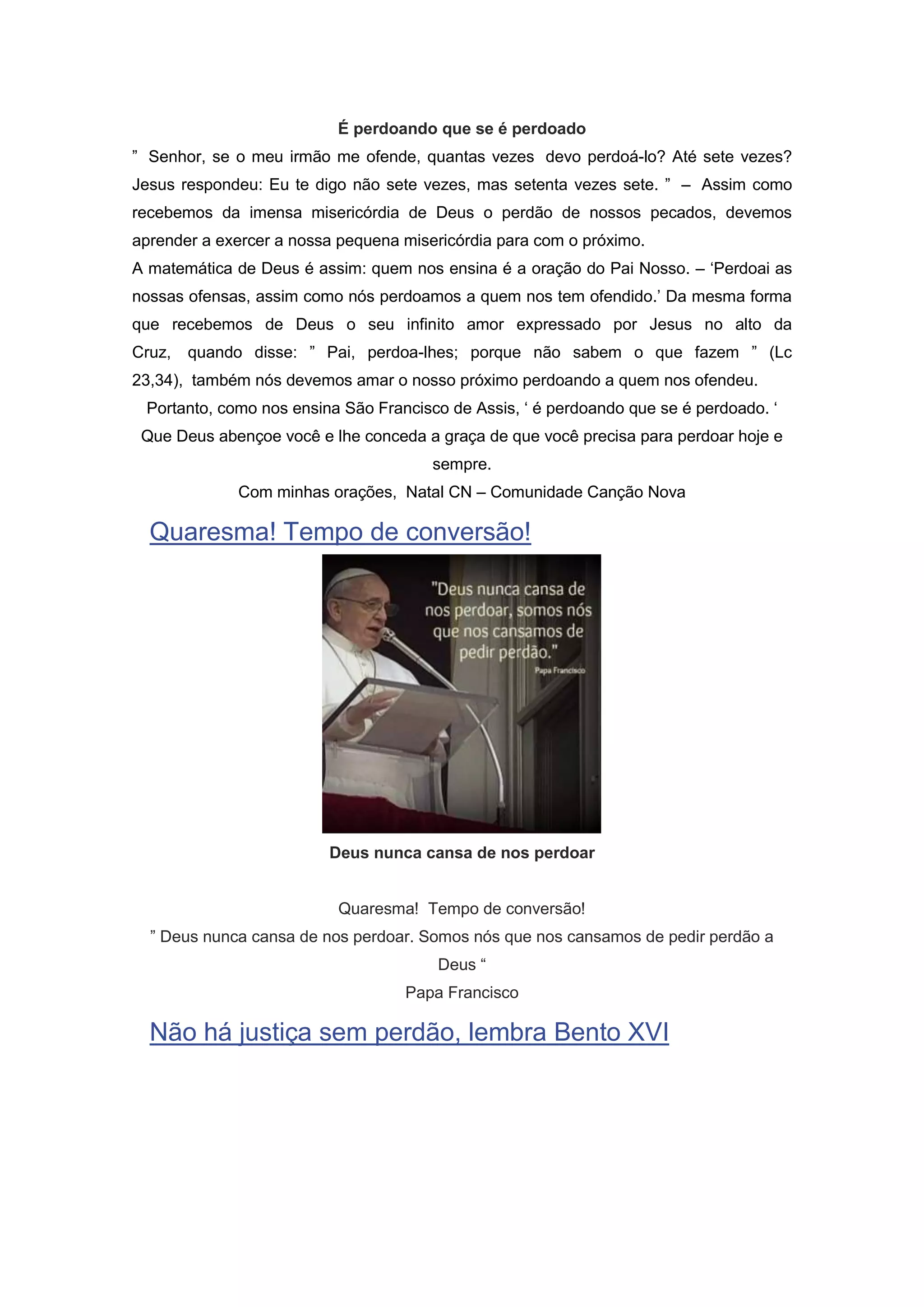 O documento discute a importância do perdão e como ele traz benefícios espirituais, psicológicos e sociais. Jesus ensinou a perdoar setenta vezes sete e que devemos perdoar os outros assim como queremos ser perdoados por Deus. Alimentar o rancor pode prejudicar a saúde, enquanto o perdão promove cura e esperança.