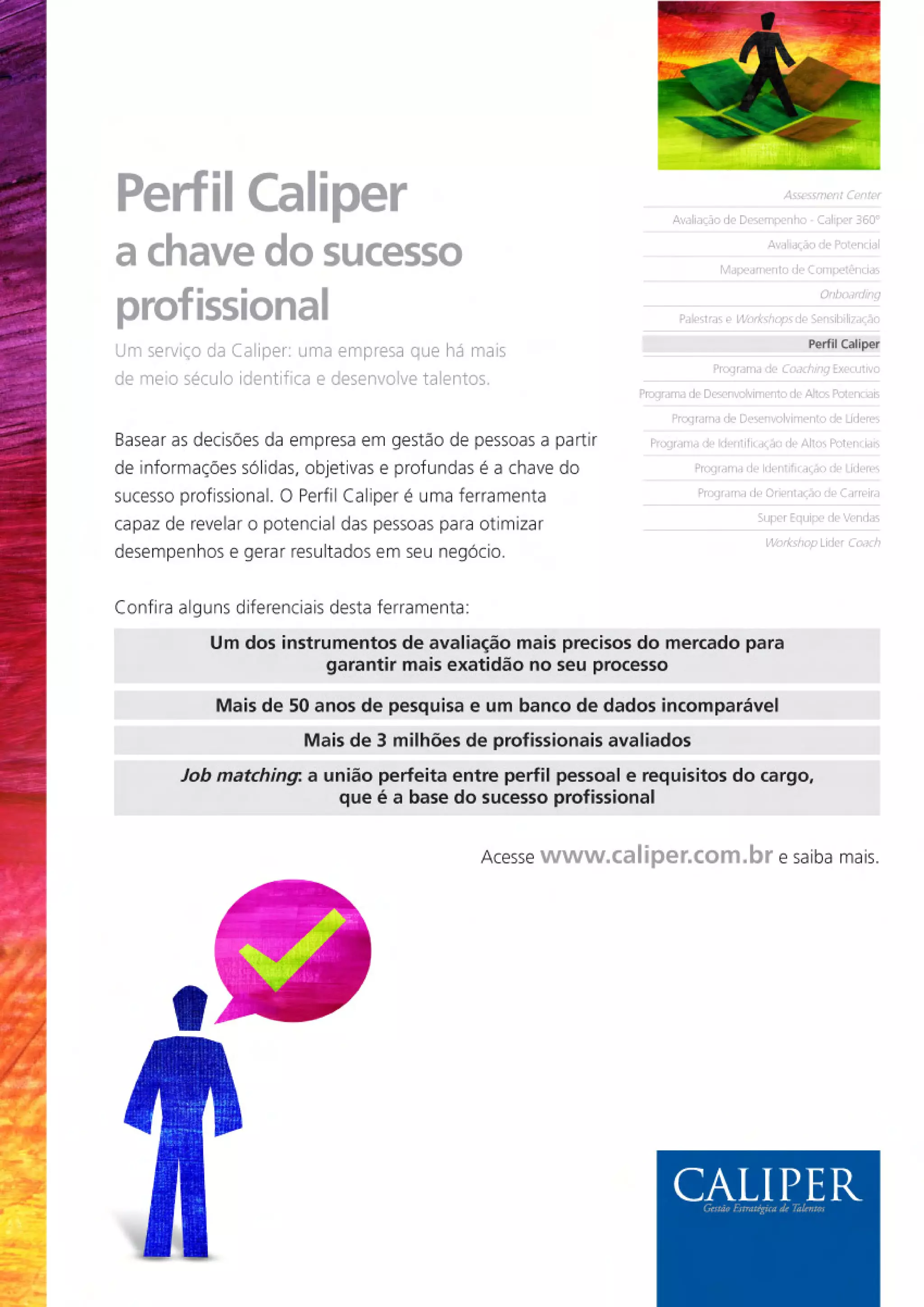 Perfil Caliper: a chave do sucesso profissional Um serviço da Caliper, uma empresa que há mais de meio século identifica e desenvolve talentos. Fale com a Caliper: (41) 3075-3400 e (11) (21) (51) (71) 4062-1450 www.caliper.com.br