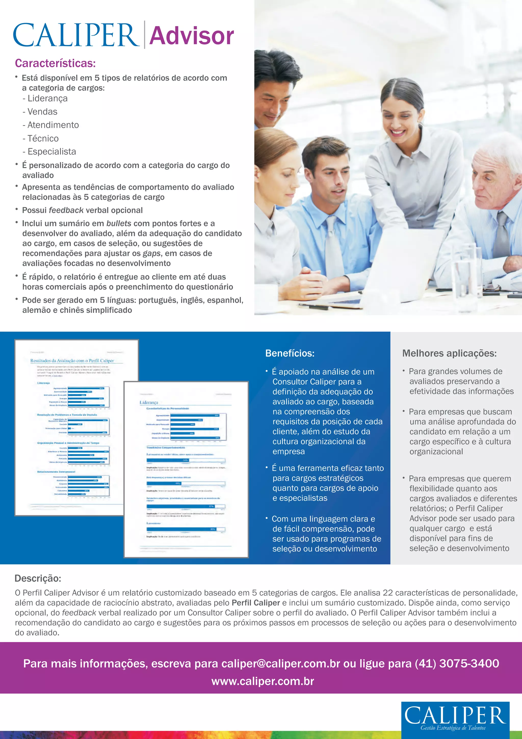 O documento descreve o perfil Caliper Advisor, uma ferramenta de avaliação de candidatos que analisa 22 características de personalidade e raciocínio abstrato, personalizando relatórios conforme categorias de cargos. Os relatórios, disponíveis em cinco idiomas, são entregues em até duas horas e incluem feedback opcional por consultores da Caliper. É voltado tanto para seleção quanto desenvolvimento de candidatos, proporcionando insights sobre adequação ao cargo e sugestões de melhorias.