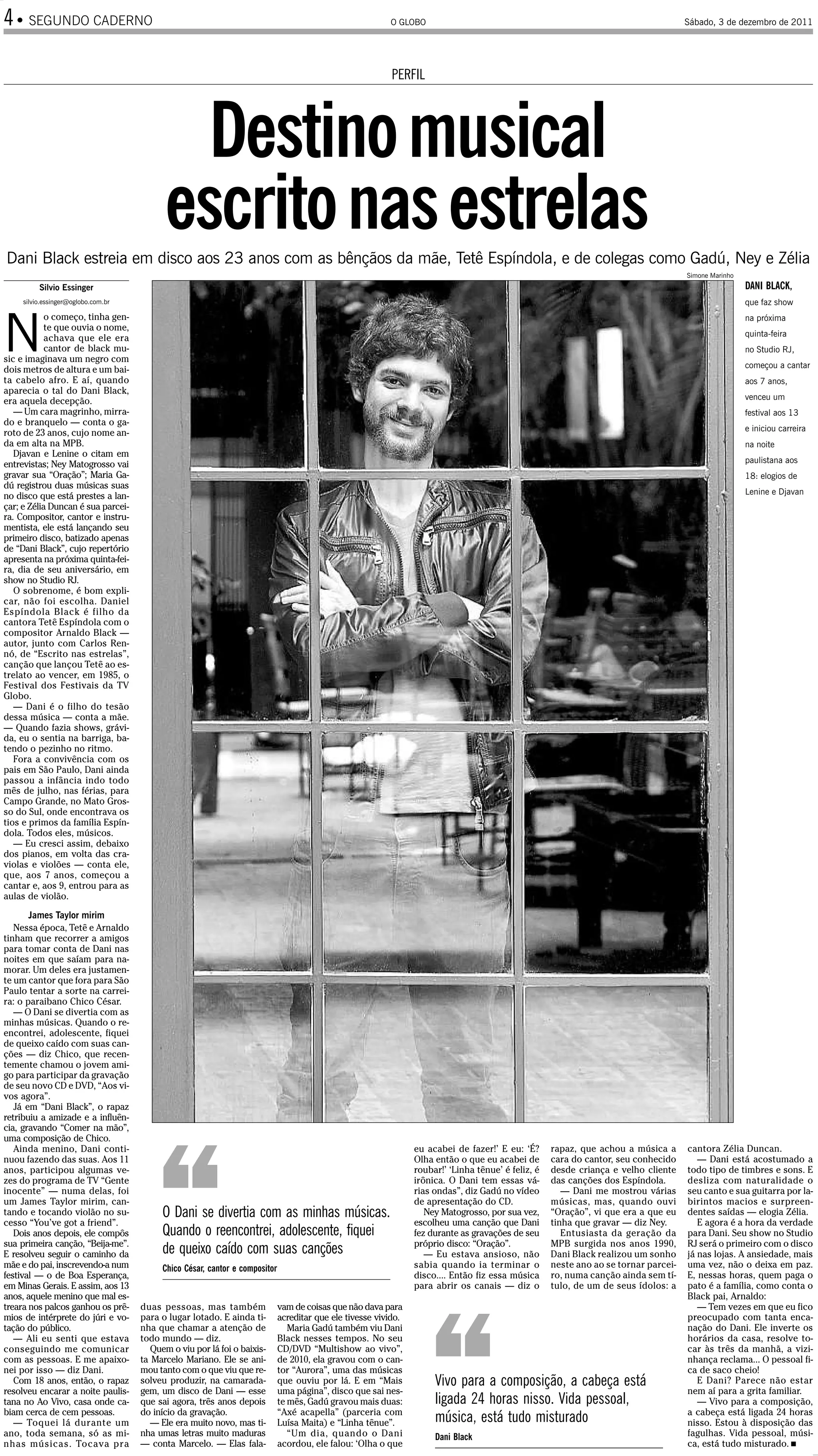1) Dani Black, filho da cantora Tetê Espíndola, está lançando seu primeiro disco aos 23 anos, após ter iniciado sua carreira musical ainda criança, influenciado por sua família de músicos.