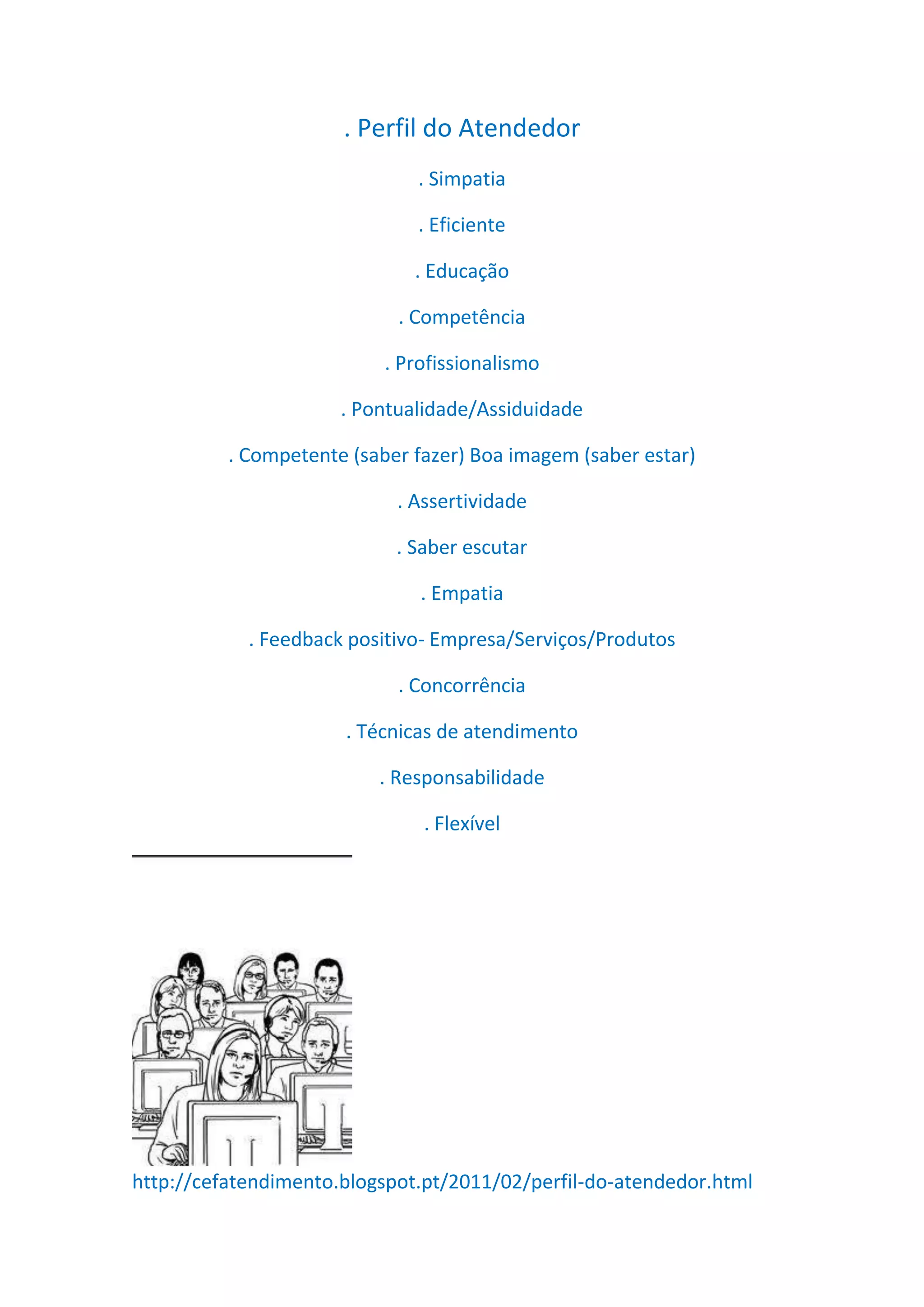 O documento descreve o perfil ideal de um atendedor, incluindo características como simpatia, eficiência, educação, competência, profissionalismo e pontualidade. Também discute habilidades como saber escutar, dar feedback positivo sobre a empresa e produtos, flexibilidade e responsabilidade.