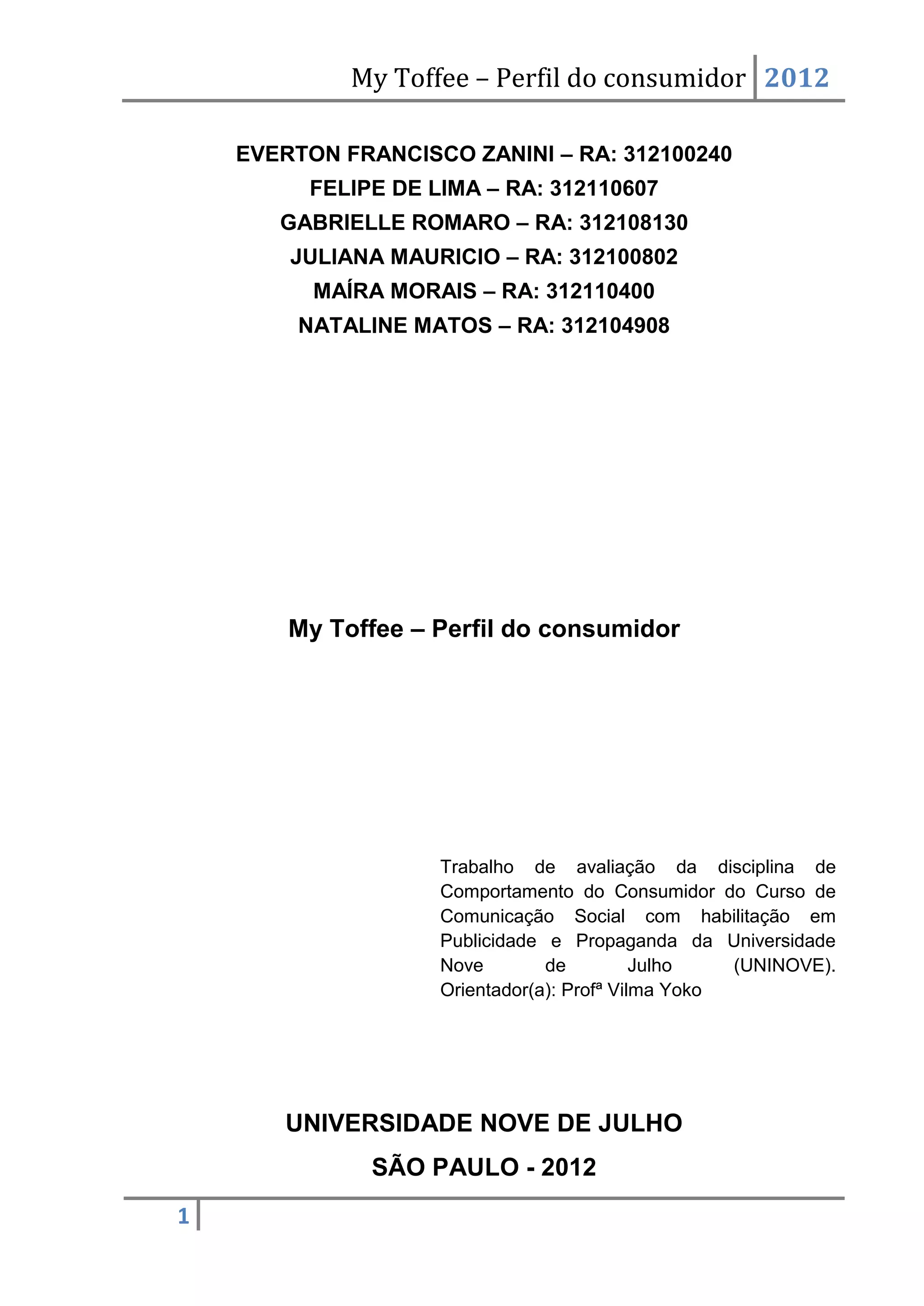 O documento traça o perfil do consumidor de balas My Toffee, identificando características como mulheres grávidas com desejo por doces, consumidores que valorizam marcas conceituadas e estilo de vida saudável, e a influência de fatores como grupo social, estágio familiar e preferências pessoais no comportamento de compra.