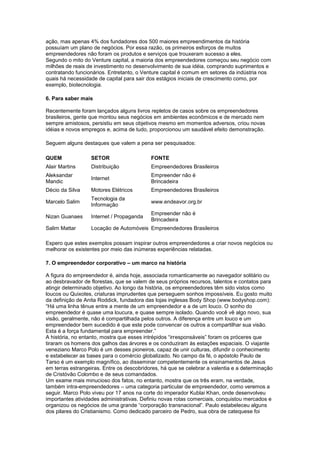 O documento discute o perfil empreendedor e os mitos em torno do empreendedorismo. Apresenta cinco qualidades essenciais de um empreendedor: criatividade, habilidade de aplicar criatividade, força de vontade, foco em geração de valor e correr riscos. Também discute conceitos errôneos como o empreendedor ser um herói solitário e que um empreendimento precisa ser grande para ser um sucesso.