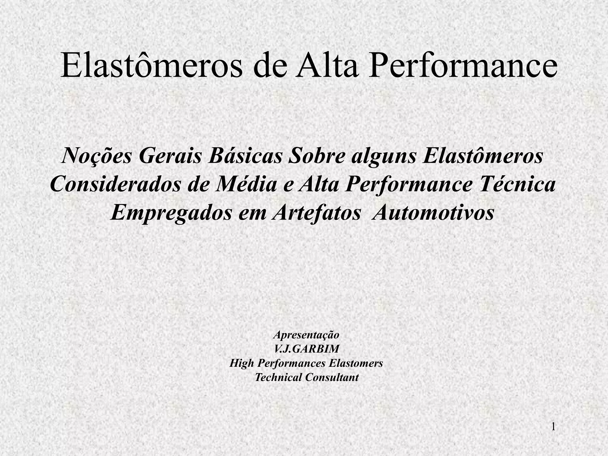 O documento aborda elastômeros de média e alta performance utilizados em aplicações automotivas, detalhando suas características, composição e métodos de vulcanização. Ele discute os tipos de elastômeros, como EPDM, policloropreno e fluorelastômero, destacando suas propriedades mecânicas e térmicas, e sugere critérios para a escolha de materiais com base em resistência química e térmica. Além disso, apresenta uma análise das especificações e aplicações desses materiais na engenharia automotiva.