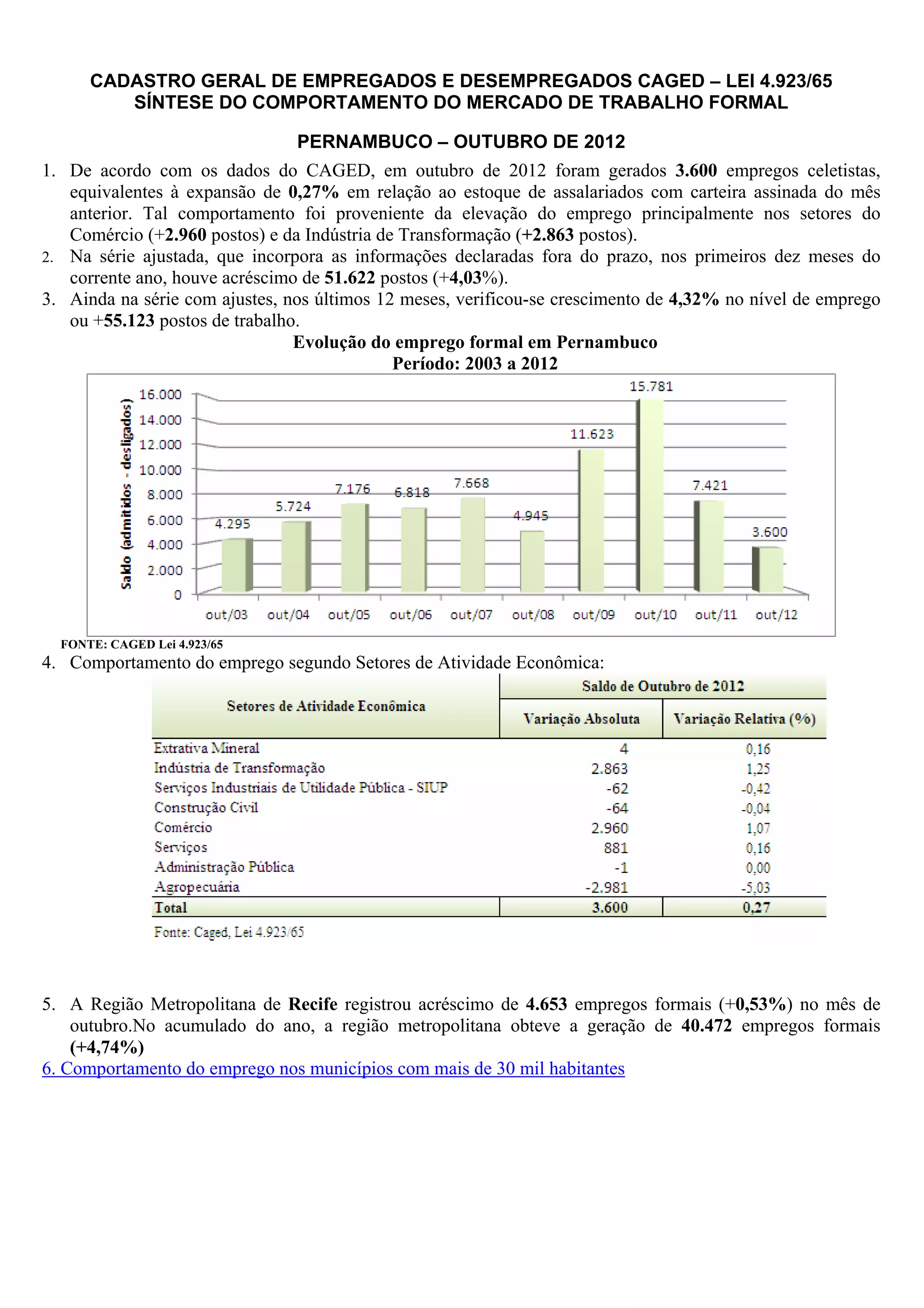 O documento apresenta dados sobre o mercado de trabalho formal em Pernambuco no mês de outubro de 2012. Foram gerados 3.600 novos empregos, principalmente no comércio e indústria. Nos primeiros dez meses do ano foram criados 51.622 postos de trabalho, aumento de 4,03%. A Região Metropolitana de Recife teve alta de 0,53% no emprego.