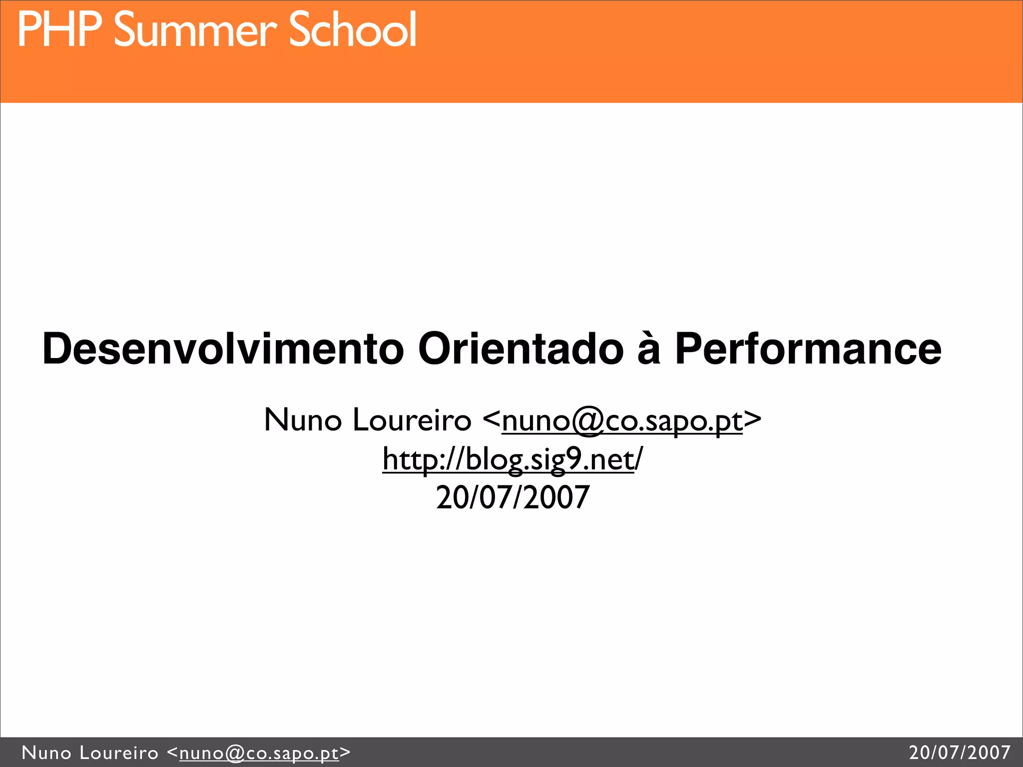1) O documento apresenta informações sobre um PHP Summer School ministrado por Nuno Loureiro, incluindo sua experiência e sobre desempenho de aplicações; 2) O documento discute arquitetura de desempenho cobrindo tópicos como conteúdo estático vs dinâmico, webservers, compressão e otimizações; 3) O documento também aborda otimizações no PHP como profiling, caching e escolha de código, além de bases de dados.