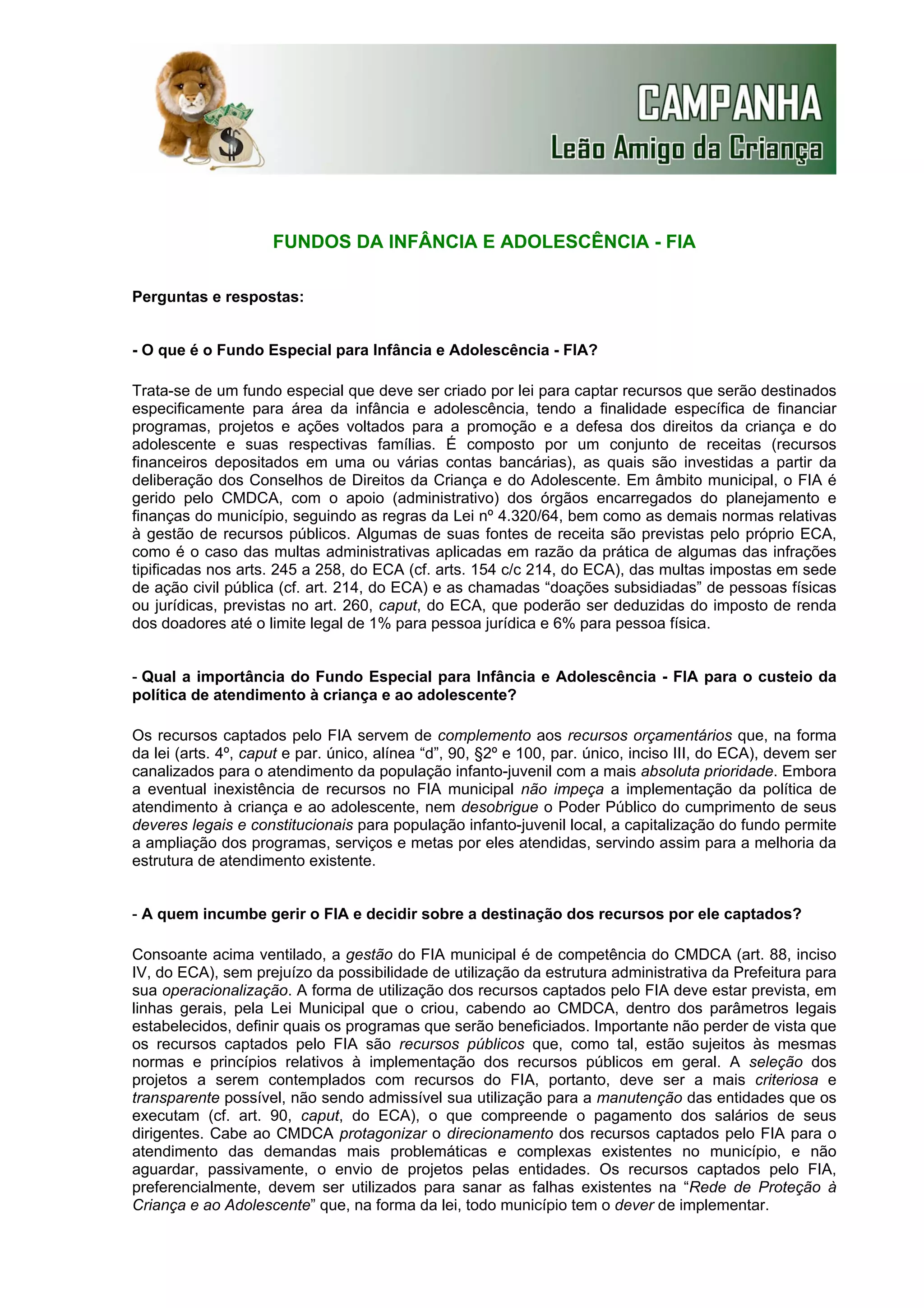 O documento explica o que é o Fundo Especial para Infância e Adolescência (FIA), sua importância para financiar programas de proteção de crianças e adolescentes e como cidadãos e empresas podem fazer doações dedutíveis do Imposto de Renda para o FIA.