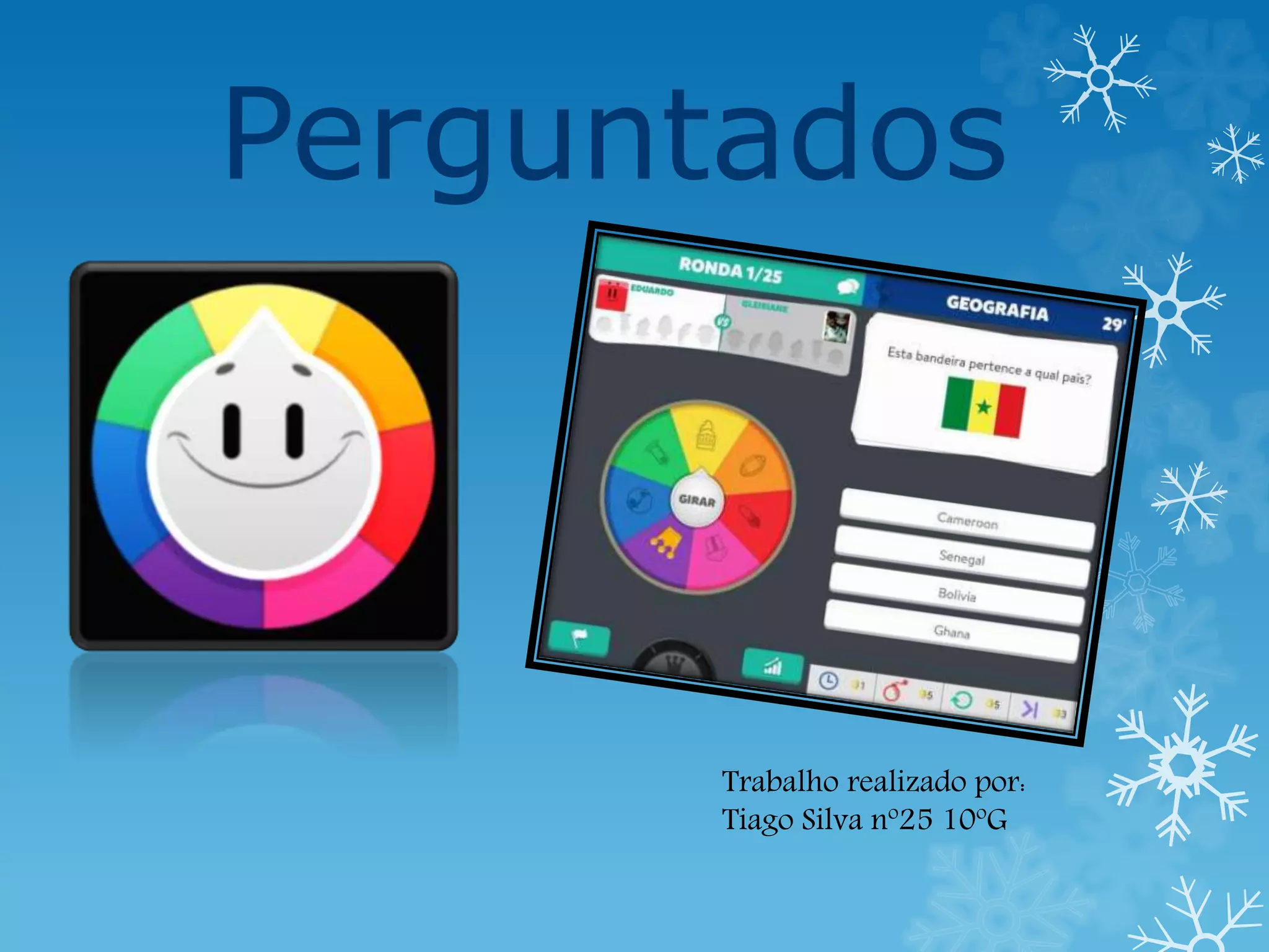 O jogo Perguntados é um jogo de perguntas e respostas em 6 categorias diferentes para ganhar as personagens correspondentes a cada categoria. Requer identidade do telefone, serviços de dados, notificações push e resolução mínima de 720x1280. O jogo pode ser baixado gratuitamente no link fornecido e um vídeo explica como jogar.