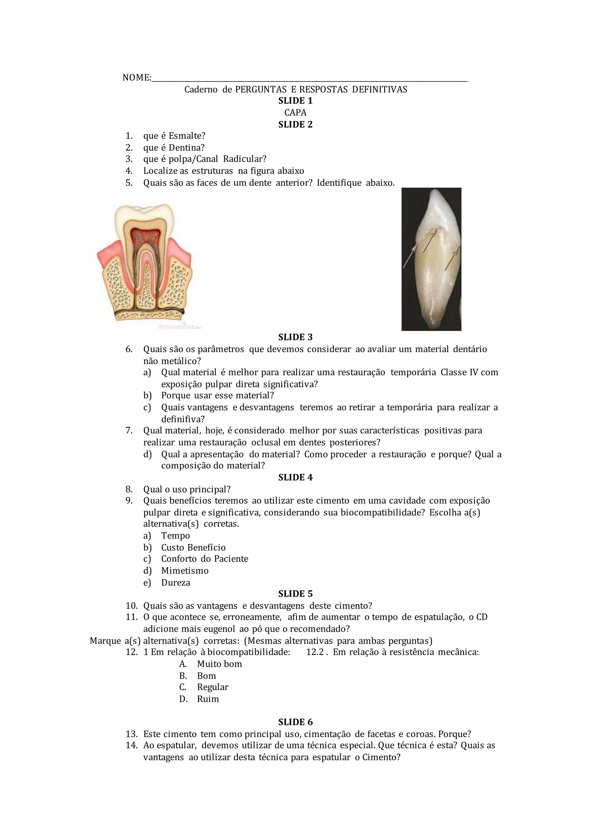 Este documento fornece perguntas e respostas sobre procedimentos odontológicos com foco em materiais dentários. Aborda tópicos como esmalte, dentina, polpa, cimentos, resinas compostas e sistemas adesivos, além de três casos clínicos sobre tratamento de lesões cariosas, fraturas e avulsão dental.