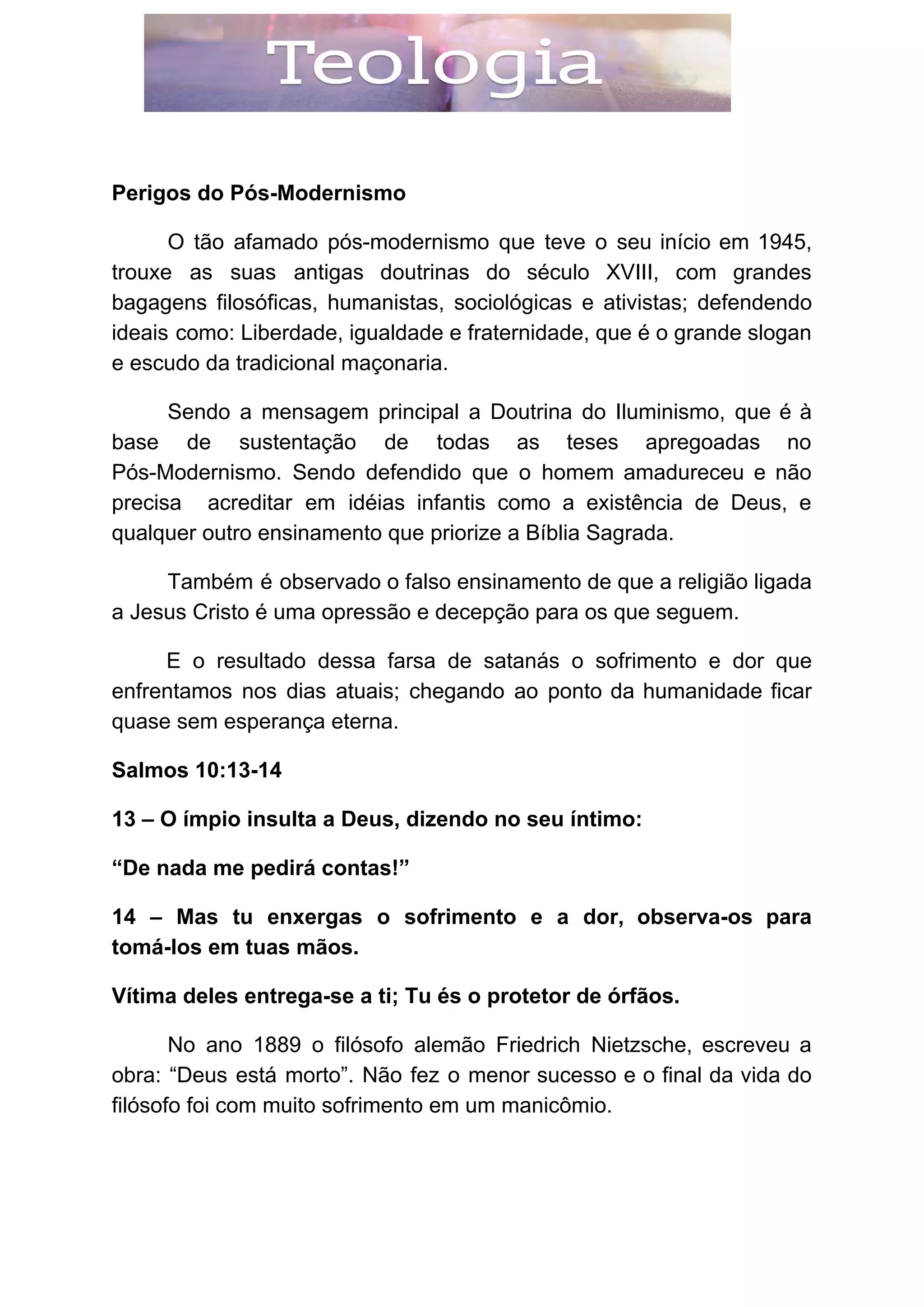 O pós-modernismo, iniciado em 1945, revive doutrinas do século XVIII, promovendo ideias de liberdade, igualdade e uma crítica à religião, incluindo a visão de que a fé cristã é opressiva. A perda de fé e a renúncia ao amor de Deus levam a um estado de desesperança, e a mensagem central é que a verdade absoluta é Deus, enquanto o espírito pós-modernista tenta afastar a humanidade dessa verdade. A aceitação de Jesus Cristo como salvador é apresentada como a única esperança contra o espírito de destruição presente na sociedade.