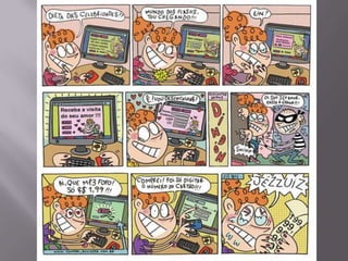 O documento aborda os perigos da internet, especialmente em relação às compras online, destacando a necessidade de precauções para evitar fraudes e roubo de dados pessoais. Sugestões incluem verificar a segurança dos sites, usar contas virtuais e manter uma vigilância sobre as atividades do cartão de crédito. O texto enfatiza a importância da segurança online e da cautela ao lidar com informações sensíveis.