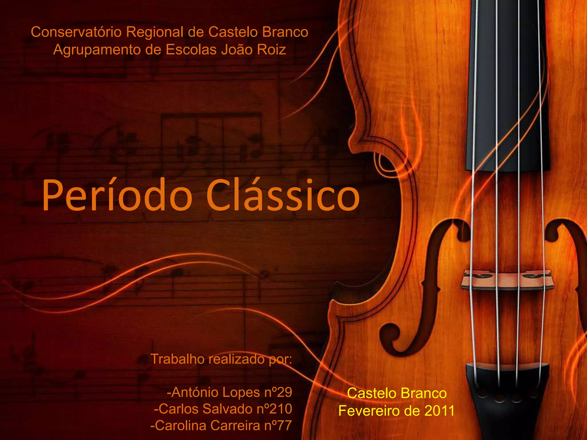 O documento fornece informações sobre a música clássica no período entre 1750-1810. Aborda tópicos como os principais instrumentos musicais da época como o piano, os principais compositores como Mozart e Beethoven, e aspectos da cultura e sociedade que influenciaram a música clássica.