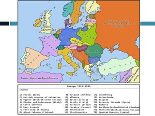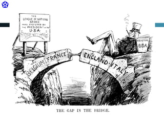 O documento resume o período entre guerras, destacando os 14 pontos de Woodrow Wilson, o Tratado de Versalhes, a criação da Liga das Nações e seus princípios de resolução pacífica de disputas e cooperação internacional. No entanto, a Liga enfrentou desafios como a ausência dos EUA e a recusa em admitir a Alemanha como membro.