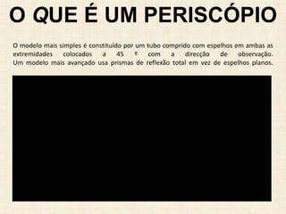 O documento explica o funcionamento de um periscópio, que consiste em um tubo longo com espelhos ou prismas em ângulos de 45° para refletir imagens fora do alcance visual. Ele é crucial em submarinos para visualizar a superfície sem ser detectado e também é utilizado em guerras para observar inimigos. O uso de prismas permite a reflexão total da luz, melhorando assim a imagem observada.