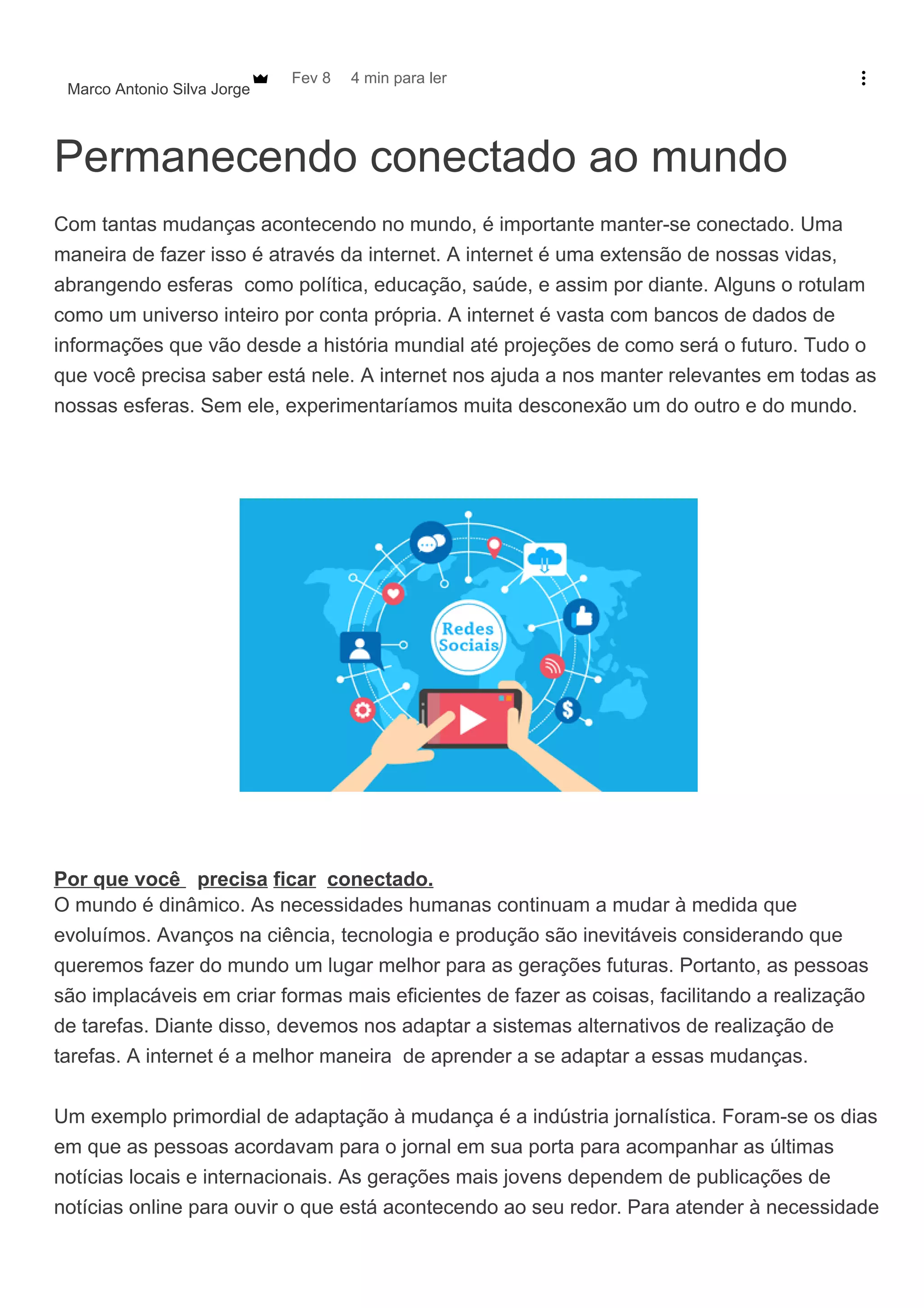 O documento discute a importância de se manter conectado ao mundo por meio da internet, destacando como ela é essencial em diversas áreas, como política, educação e saúde. A adaptação às mudanças, especialmente na indústria jornalística e no comércio digital, é enfatizada como crucial para a relevância e sucesso pessoal e profissional. Além disso, menciona as vantagens de estar conectado, como acesso a informação, interação social e oportunidades de educação.
