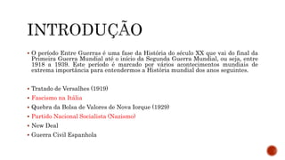 O período entre guerras, de 1918 a 1939, foi marcado por eventos significativos como a crise da bolsa de Nova York em 1929, que resultou em uma grande depressão econômica mundial. O New Deal, implementado nos EUA entre 1933 e 1937, visava recuperar a economia e reduzir o desemprego através de investimentos públicos e reformas. A guerra civil espanhola (1936-1939) foi um conflito brutal entre forças fascistas e republicanas, resultando na vitória de Franco e na instauração de uma ditadura na Espanha.