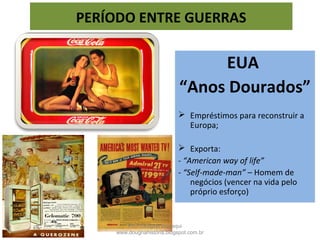 O documento resume o período entre as guerras mundiais e a Segunda Guerra Mundial, incluindo a crise econômica de 1929 nos EUA, a ascensão de regimes totalitários na Europa e as políticas de Hitler que levaram à eclosão da guerra em 1939.